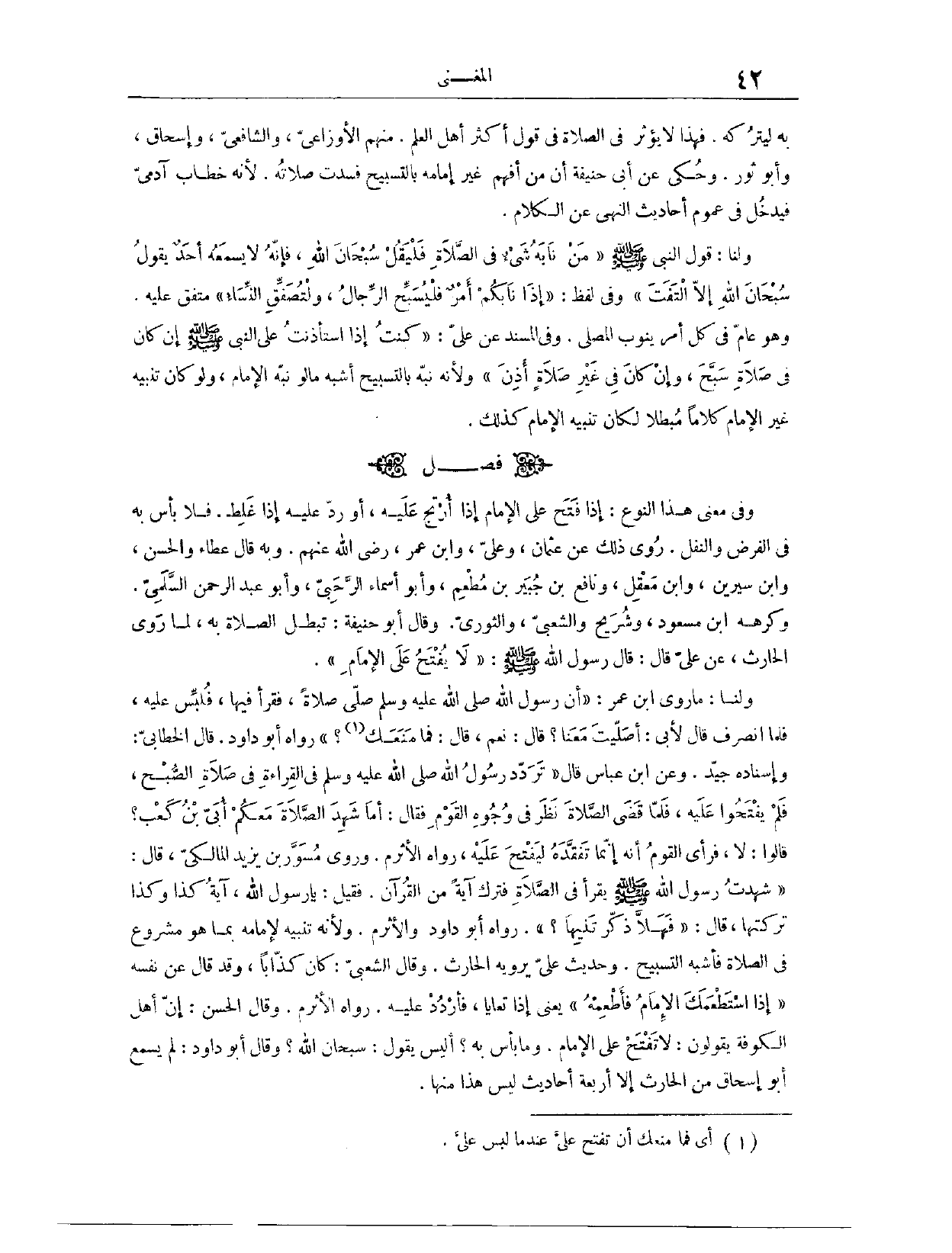 (٩٤٣) فَصْلٌ: وَفِي مَعْنَى هَذَا النَّوْعِ، إذَا فَتَحَ عَلَى الْإِمَامِ إذَا ارْتَجَّ عَلَيْهِ، أَوْ رَدَّ عَلَيْهِ إذَا غَلِطَ فَلَا بَأْسَ بِهِ فِي الْفَرْضِ وَالنَّفَلِ. وَرُوِيَ ذَلِكَ عَنْ عُثْمَانَ، وَعَلِيٍّ، وَابْنِ عُمَرَ. - رَضِيَ اللَّهُ عَنْهُمْ - وَبِهِ قَالَ عَطَاءٌ، وَالْحَسَنُ، وَابْنُ سِيرِينَ، وَابْنُ مَعْقِلٍ، وَنَافِعُ بْنُ جُبَيْرِ بْنِ مُطْعِمٍ، وَأَبُو أَسْمَاءَ الرَّحَبِيُّ، وَأَبُو عَبْدِ الرَّحْمَنِ السُّلَمِيُّ. وَكَرِهَهُ ابْنُ مَسْعُودٍ وَشُرَيْحٌ، وَالشَّعْبِيُّ، وَالثَّوْرِيُّ، وَقَالَ أَبُو حَنِيفَةَ، تَبْطُلُ الصَّلَاةُ بِهِ؛ لِمَا رَوَى الْحَارِثُ عَنْ عَلِيٍّ، قَالَ: قَالَ رَسُولُ اللَّهِ - صَلَّى اللَّهُ عَلَيْهِ وَسَلَّمَ - «لَا يَفْتَحُ عَلَى الْإِمَامِ» وَلَنَا: مَا رَوَى ابْنُ عُمَرَ، «أَنَّ رَسُولَ اللَّهِ - صَلَّى اللَّهُ عَلَيْهِ وَسَلَّمَ - صَلَّى صَلَاةً، فَقَرَأَ فِيهَا، فَلُبِسَ عَلَيْهِ، فَلَمَّا انْصَرَفَ قَالَ لِأُبَيٍّ أَصْلَيْتَ مَعَنَا؟ . قَالَ: نَعَمْ قَالَ: فَمَا مَنَعَك؟» رَوَاهُ أَبُو دَاوُد قَالَ الْخَطَّابِيُّ وَإِسْنَادُهُ جَيِّدٌ
