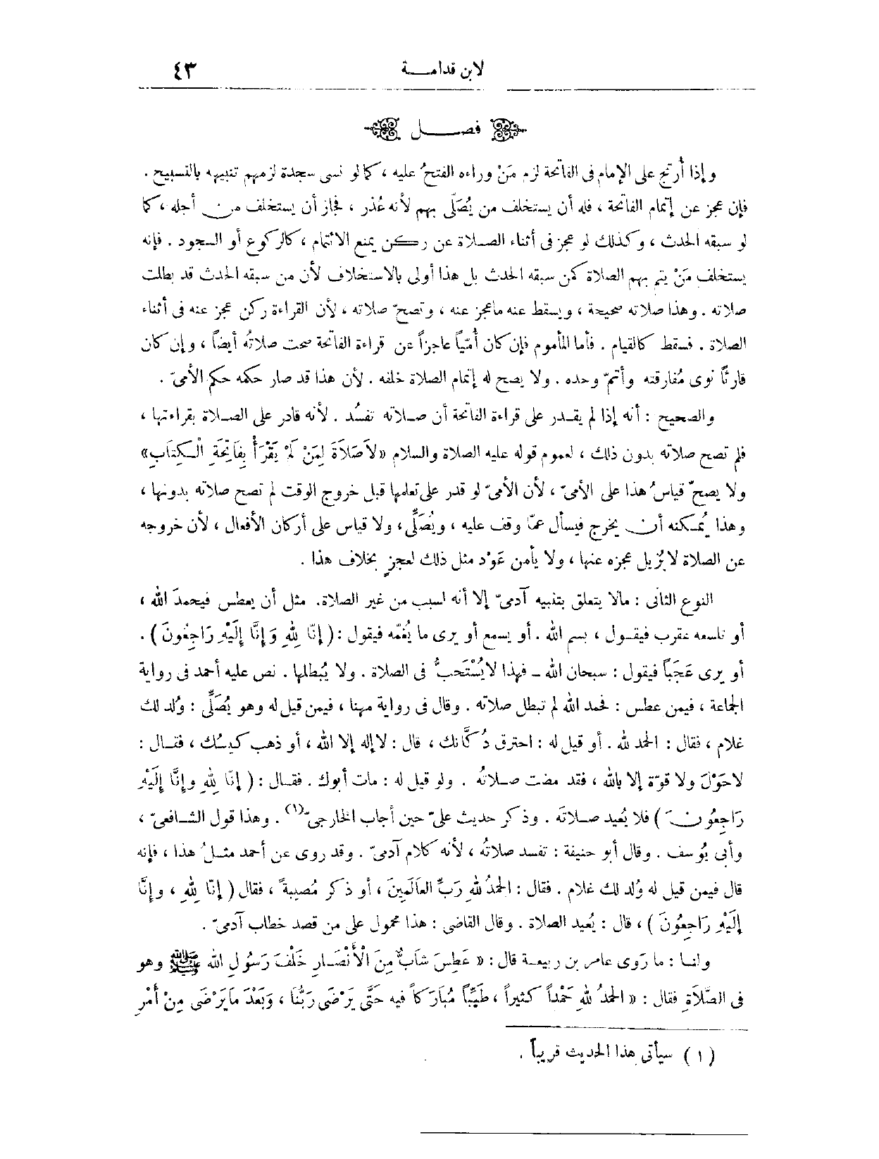 وَهَذَا قَوْلُ الشَّافِعِيِّ، وَأَبِي يُوسُفَ. وَقَالَ أَبُو حَنِيفَةَ: تَفْسُدُ صَلَاتُهُ لِأَنَّهُ كَلَامُ آدَمِيٍّ وَقَدْ رُوِيَ عَنْ أَحْمَدَ مِثْلُ هَذَا؛ فَإِنَّهُ قَالَ فِي مَنْ قِيلَ لَهُ: وُلِدَ لَك غُلَامٌ. فَقَالَ: الْحَمْدُ لِلَّهِ رَبِّ الْعَالَمِينَ. أَوْ ذَكَرَ مُصِيبَةً، فَقَالَ: {إِنَّا لِلَّهِ وَإِنَّا إِلَيْهِ رَاجِعُونَ} [البقرة: ١٥٦] . قَالَ يُعِيدُ الصَّلَاةَ. وَقَالَ الْقَاضِي: هَذَا مَحْمُولٌ عَلَى مَنْ قَصَدَ خِطَابَ آدَمِيٍّ. وَلَنَا مَا رَوَى عَامِرُ بْنُ رَبِيعَةَ، قَالَ: «عَطَسَ شَابٌّ مِنْ الْأَنْصَارِ خَلْفَ رَسُولِ اللَّهِ - صَلَّى اللَّهُ عَلَيْهِ وَسَلَّمَ - وَهُوَ فِي الصَّلَاةِ، فَقَالَ: الْحَمْدُ لِلَّهِ حَمْدًا كَثِيرًا طَيِّبًا مُبَارَكًا فِيهِ، حَتَّى يَرْضَى رَبُّنَا، وَبَعْدَمَا يَرْضَى مِنْ أَمْرِ