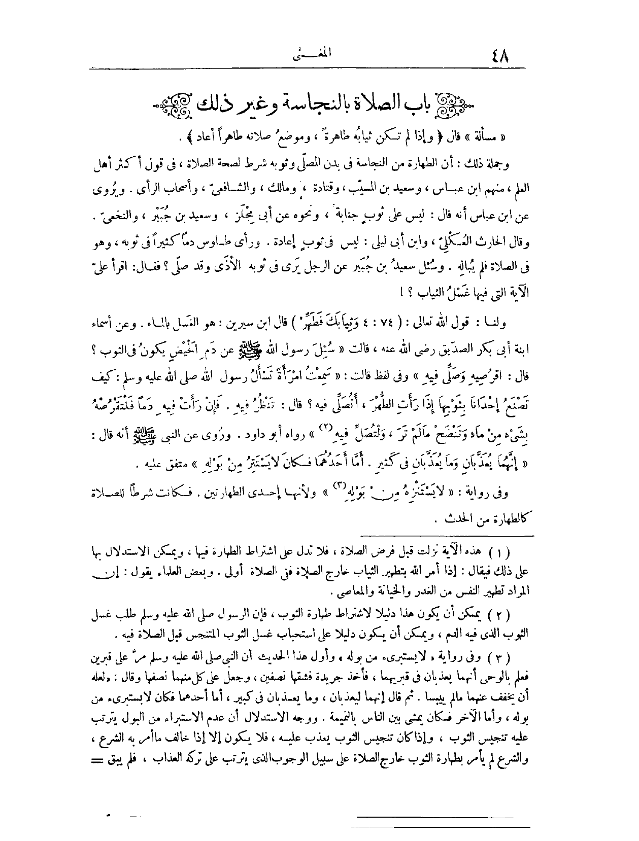 مَسْأَلَةٌ: قَالَ: (وَإِذَا لَمْ تَكُنْ ثِيَابُهُ طَاهِرَةً، وَمَوْضِعُ صَلَاتِهِ طَاهِرًا، أَعَادَ) وَجُمْلَةُ ذَلِكَ، أَنَّ الطَّهَارَةَ مِنْ النَّجَاسَةِ فِي بَدَنِ الْمُصَلِّي وَثَوْبِهِ شَرْطٌ لِصِحَّةِ الصَّلَاةِ فِي قَوْلِ أَكْثَرِ أَهْلِ الْعِلْمِ؛ مِنْهُمْ ابْنُ عَبَّاسٍ وَسَعِيدُ بْنُ الْمُسَيِّبِ وَقَتَادَةُ وَمَالِكٌ وَالشَّافِعِيُّ، وَأَصْحَابُ الرَّأْيِ. وَيُرْوَى عَنْ ابْنِ عَبَّاسٍ أَنَّهُ قَالَ: لَيْسَ عَلَى ثَوْبٍ جَنَابَةٌ. وَنَحْوُهُ عَنْ أَبِي مِجْلَزٍ وَسَعِيدِ بْنِ جُبَيْرٍ وَالنَّخَعِيِّ. وَقَالَ الْحَارِثُ الْعُكْلِيُّ وَابْنُ أَبِي لَيْلَى: لَيْسَ فِي ثَوْبٍ إعَادَةٌ، وَرَأَى طَاوُسٌ دَمًا كَثِيرًا فِي ثَوْبِهِ، وَهُوَ فِي الصَّلَاةِ فَلَمْ يُبَالِهِ. وَسُئِلَ سَعِيدُ بْنُ جُبَيْرٍ، عَنْ الرَّجُلِ يَرَى فِي ثَوْبِهِ الْأَذَى وَقَدْ صَلَّى؟ فَقَالَ: اقْرَأْ عَلَيَّ الْآيَةَ الَّتِي فِيهَا غَسْلُ الثِّيَابِ.