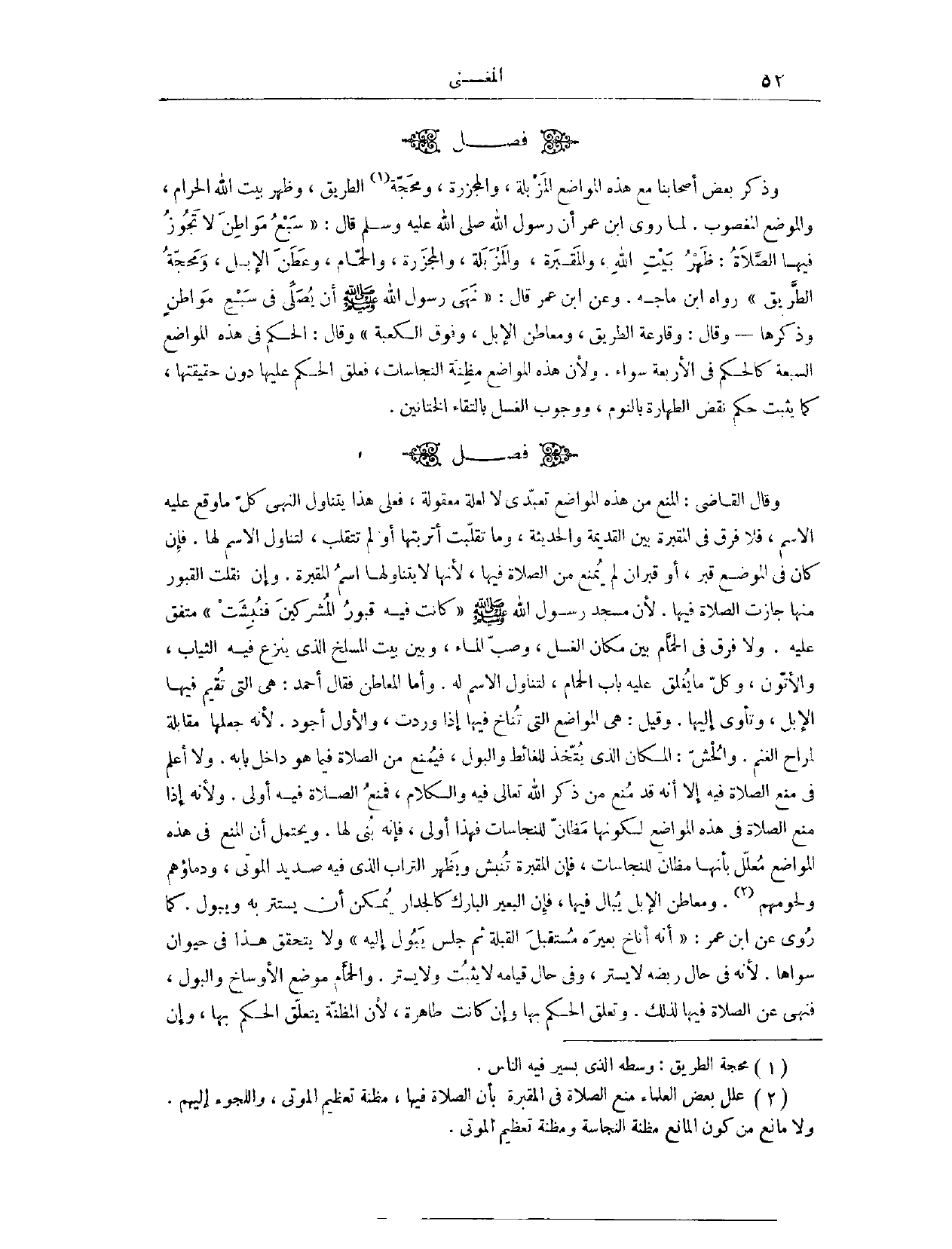 (٩٥٨) فَصْلٌ: وَذَكَرَ بَعْضُ أَصْحَابِنَا مَعَ هَذِهِ الْمَوَاضِعِ الْمَزْبَلَةَ، وَالْمَجْزَرَةَ، وَمَحَجَّةَ الطَّرِيقِ، وَظَهْرَ بَيْتِ اللَّهِ الْحَرَامِ، وَالْمَوْضِعَ الْمَغْصُوبَ لِمَا رَوَى ابْنُ عُمَرَ، أَنَّ رَسُولَ اللَّهِ صَلَّى - صَلَّى اللَّهُ عَلَيْهِ وَسَلَّمَ - قَالَ: «سَبْعُ مَوَاطِنَ لَا تَجُوزُ فِيهَا الصَّلَاةُ؛ ظَهْرُ بَيْتِ اللَّهِ، وَالْمَقْبَرَةُ، وَالْمَزْبَلَةُ، وَالْمَجْزَرَةُ، وَالْحَمَّامُ، وَعَطَنُ الْإِبِلِ، وَمَحَجَّةُ الطَّرِيقِ» رَوَاهُ ابْنُ مَاجَهْ. وَعَنْ ابْنِ عُمَرَ قَالَ: «نَهَى رَسُولُ اللَّهِ - صَلَّى اللَّهُ عَلَيْهِ وَسَلَّمَ - أَنْ يُصَلَّى فِي سَبْعِ مَوَاطِن. وَذَكَرَهَا، وَقَالَ: وَقَارِعَةُ الطَّرِيقِ، وَمَعَاطِنُ الْإِبِلِ، وَفَوْقَ الْكَعْبَةِ» . وَقَالَ: الْحُكْمُ فِي هَذِهِ الْمَوَاضِعِ السَّبْعَةِ كَالْحُكْمِ فِي الْأَرْبَعَةِ سَوَاءً.