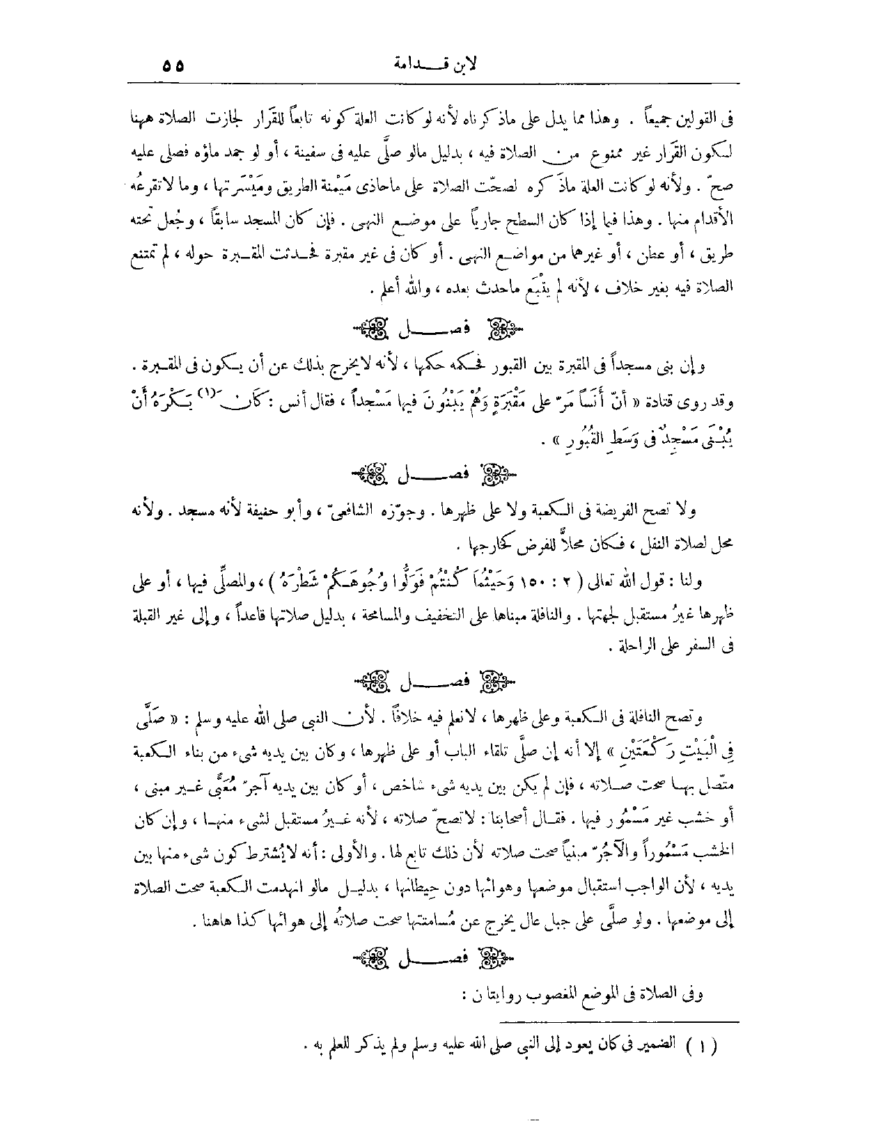 (٩٦٤) فَصْلٌ: وَلَا تَصِحُّ الْفَرِيضَةُ فِي الْكَعْبَةِ، وَلَا عَلَى ظَهْرِهَا. وَجَوَّزَهُ الشَّافِعِيُّ وَأَبُو حَنِيفَةَ؛ لِأَنَّهُ مَسْجِدٌ، وَلِأَنَّهُ مَحَلٌّ لِصَلَاةِ النَّفْلِ، فَكَانَ مَحَلًّا لِلْفَرْضِ، كَخَارِجِهَا. وَلَنَا: قَوْلُ اللَّهِ تَعَالَى {وَحَيْثُ مَا كُنْتُمْ فَوَلُّوا وُجُوهَكُمْ شَطْرَهُ} [البقرة: ١٤٤] . وَالْمُصَلِّي فِيهَا أَوْ عَلَى ظَهْرِهَا غَيْرُ مُسْتَقْبِلٍ لِجِهَتِهَا، وَالنَّافِلَةُ مَبْنَاهَا عَلَى التَّخْفِيفِ وَالْمُسَامَحَةِ، بِدَلِيلِ صَلَاتِهَا قَاعِدًا، وَإِلَى غَيْرِ الْقِبْلَةِ، فِي السَّفَرِ عَلَى الرَّاحِلَةِ. (٩٦٥) فَصْلٌ: وَتَصِحُّ النَّافِلَةُ فِي الْكَعْبَةِ وَعَلَى ظَهْرِهَا. لَا نَعْلَمُ فِيهِ خِلَافًا؛ لِأَنَّ النَّبِيَّ - صَلَّى اللَّهُ عَلَيْهِ وَسَلَّمَ - صَلَّى فِي الْبَيْتِ رَكْعَتَيْنِ.