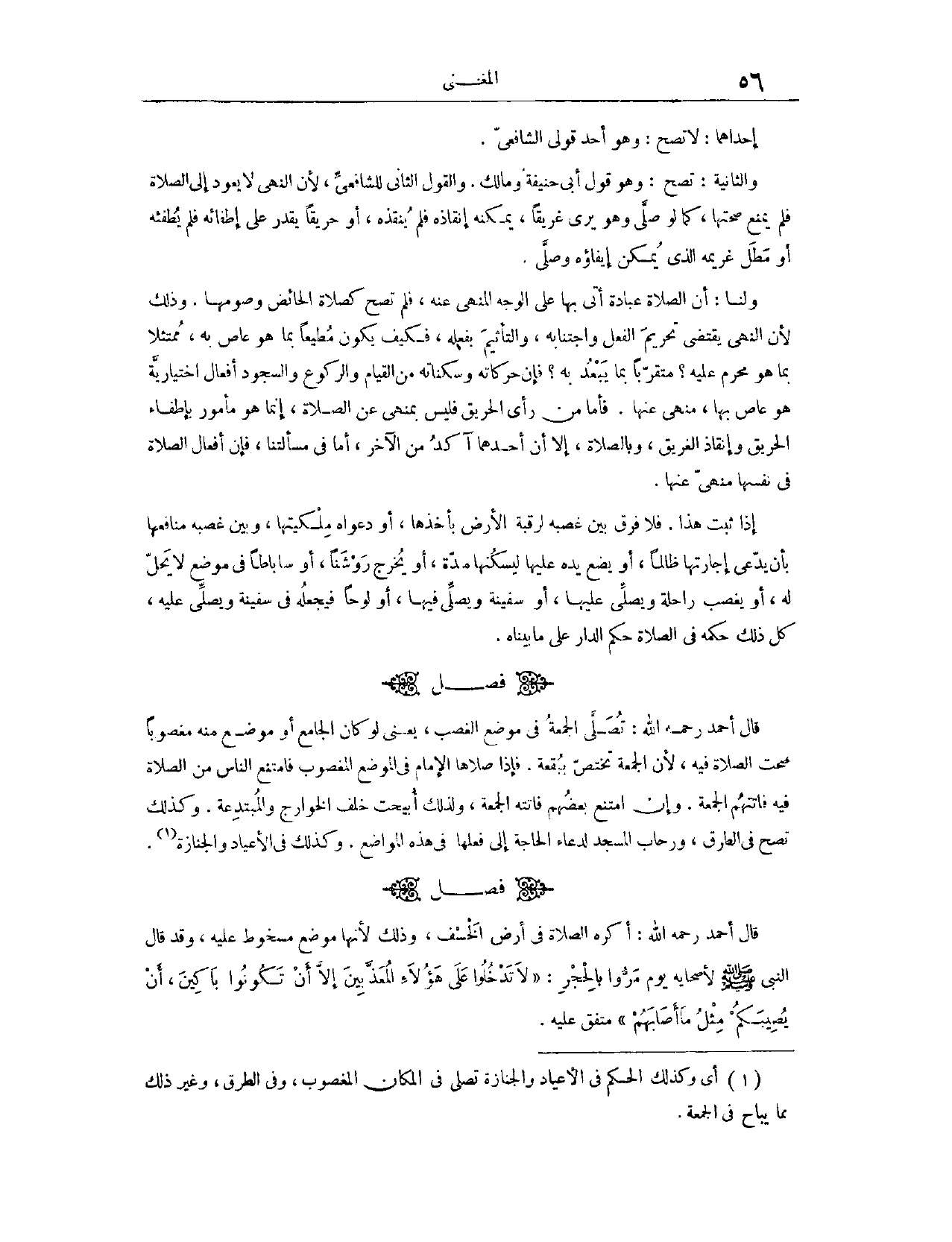 (٩٦٨) فَصْلٌ: قَالَ أَحْمَدُ - رَحِمَهُ اللَّهُ -: أَكْرَهُ الصَّلَاةَ فِي أَرْضِ الْخَسْفِ؛ وَذَلِكَ لِأَنَّهَا مَوْضِعٌ مَسْخُوطٌ عَلَيْهِ. وَقَدْ «قَالَ النَّبِيُّ - صَلَّى اللَّهُ عَلَيْهِ وَسَلَّمَ - لِأَصْحَابِهِ يَوْمَ مَرَّ بِالْحِجْرِ: لَا تَدْخُلُوا عَلَى هَؤُلَاءِ الْمُعَذَّبِينَ إلَّا أَنْ تَكُونُوا بَاكِينَ، أَنْ يُصِيبَكُمْ مِثْلُ مَا أَصَابَهُمْ.» مُتَّفَقٌ عَلَيْهِ.
