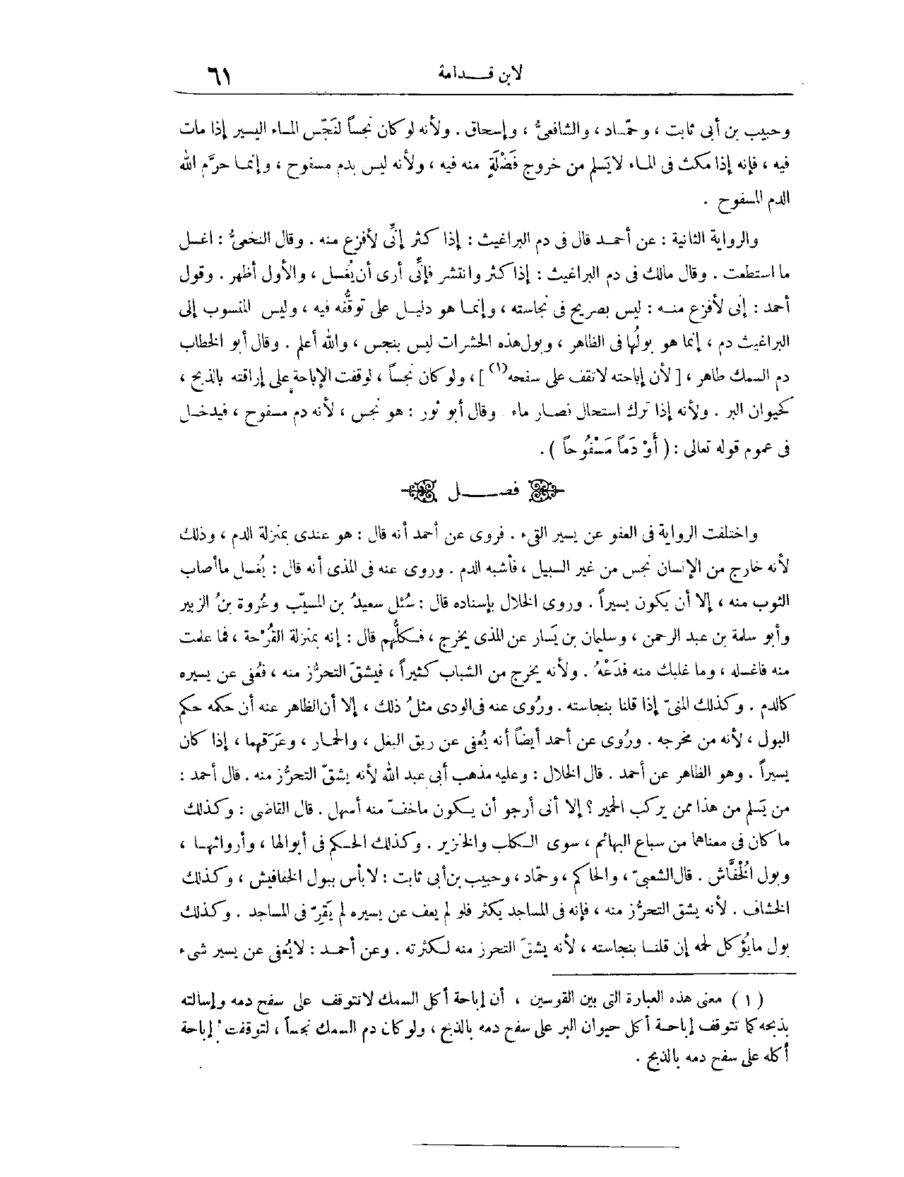 وَالْأَوَّلُ أَظْهَرُ. وَقَوْلُ أَحْمَدَ: إنِّي لَأَفْزَعُ مِنْهُ. لَيْسَ بِصَرِيحٍ فِي نَجَاسَتِهِ، وَإِنَّمَا هُوَ دَلِيلٌ عَلَى تَوَقُّفِهِ فِيهِ، وَلَيْسَ الْمَنْسُوبُ إلَى الْبَرَاغِيثِ دَمًا إنَّمَا هُوَ بَوْلُهَا فِي الظَّاهِرِ، وَبَوْلُ هَذِهِ الْحَشَرَاتِ لَيْسَ بِنَجِسٍ، وَاَللَّهُ أَعْلَمُ. وَقَالَ أَبُو الْخَطَّابِ: دَمُ السَّمَكِ طَاهِرٌ؛ لِأَنَّ إبَاحَتَهُ لَا تَقِفُ عَلَى سَفْحِهِ، وَلَوْ كَانَ نَجِسًا، لَوَقَفَتْ الْإِبَاحَةُ عَلَى إرَاقَتِهِ بِالذَّبْحِ كَحَيَوَانِ الْبَرِّ، وَلِأَنَّهُ إذَا تُرِكَ اسْتَحَالَ فَصَارَ مَاءً. وَقَالَ أَبُو ثَوْرٍ: هُوَ نَجِسٌ؛ لِأَنَّهُ دَمٌ مَسْفُوحٌ، فَيَدْخُلُ فِي عُمُومِ قَوْله تَعَالَى {أَوْ دَمًا مَسْفُوحًا} [الأنعام: ١٤٥] .