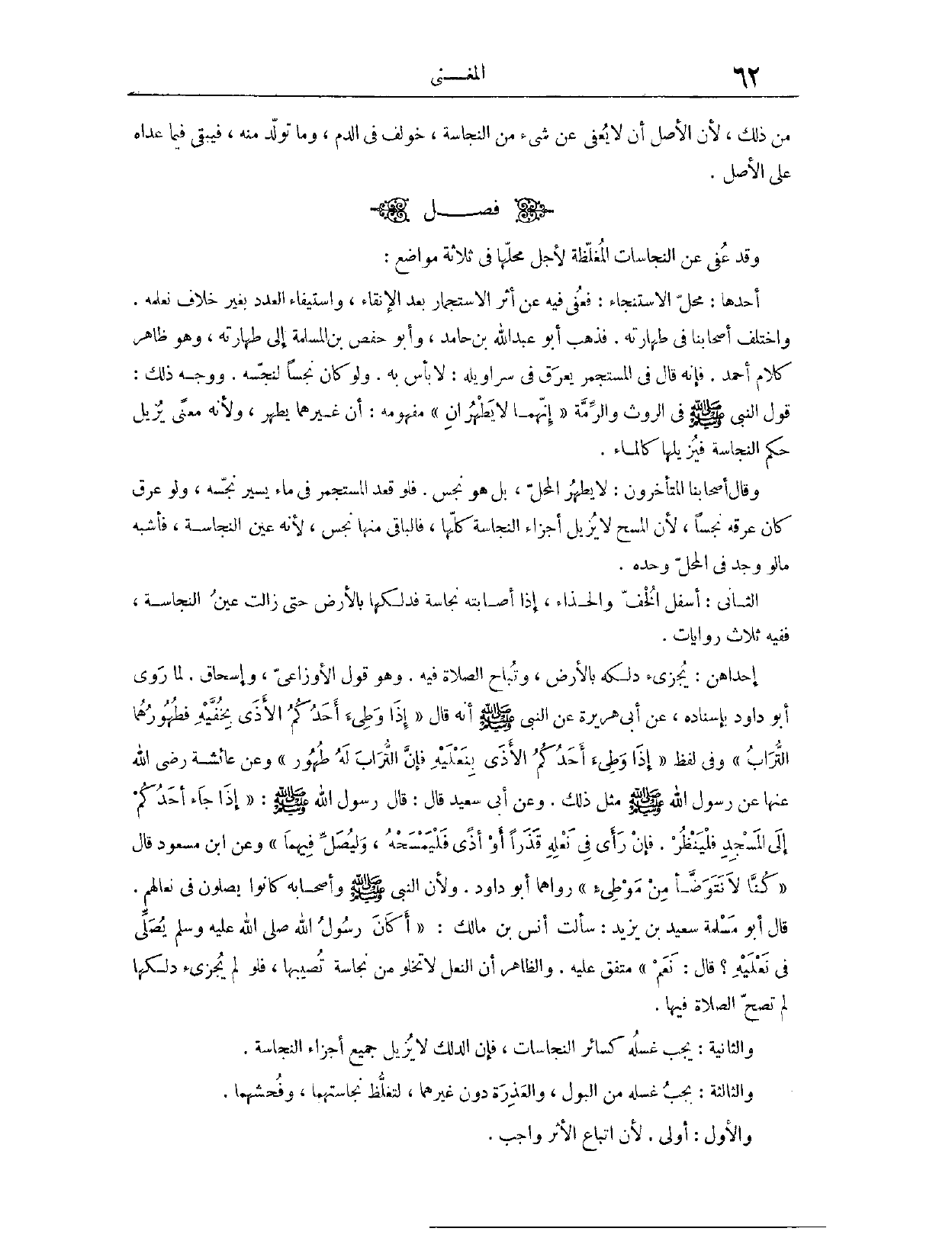 (٩٨١) فَصْلٌ: وَقَدْ عُفِيَ عَنْ النَّجَاسَاتِ الْمُغَلَّظَةِ لِأَجْلِ مَحَلِّهَا، فِي ثَلَاثَةِ مَوَاضِعَ؛ أَحَدُهَا، مَحَلُّ الِاسْتِنْجَاءِ، فَعُفِيَ فِيهِ عَنْ أَثَرِ الِاسْتِجْمَارِ بَعْدَ الْإِنْقَاءِ، وَاسْتِيفَاءِ الْعَدَدِ، بِغَيْرِ خِلَافٍ نَعْلَمُهُ. وَاخْتَلَفَ أَصْحَابُنَا فِي طَهَارَتِهِ، فَذَهَبَ أَبُو عَبْدِ اللَّهِ بْنُ حَامِدٍ، وَأَبُو حَفْصِ بْنُ الْمَسْلَمَةِ، إلَى طَهَارَتِهِ. وَهُوَ ظَاهِرُ كَلَامِ أَحْمَدَ؛ فَإِنَّهُ قَالَ فِي الْمُسْتَجْمِرُ يَعْرَقُ فِي سَرَاوِيلِهِ: لَا بَأْسَ بِهِ. وَلَوْ كَانَ نَجِسًا لَنَجَّسَهُ، وَوَجْهُ ذَلِكَ قَوْلُ النَّبِيِّ - صَلَّى اللَّهُ عَلَيْهِ وَسَلَّمَ - «، فِي الرَّوْثِ وَالرِّمَّةِ: إنَّهُمَا لَا يَطْهُرَانِ» . مَفْهُومُهُ أَنَّ غَيْرَهُمَا يَطْهُرُ، وَلِأَنَّهُ مَعْنًى يُزِيلُ حُكْمَ النَّجَاسَةِ، فَيُزِيلُهَا كَالْمَاءِ. وَقَالَ أَصْحَابُنَا الْمُتَأَخِّرُونَ: لَا يَطْهُرُ الْمَحَلُّ، بَلْ هُوَ نَجِسٌ، فَلَوْ قَعَدَ الْمُسْتَجْمِرُ فِي مَاءٍ يَسِيرٍ نَجَّسَهُ، وَلَوْ عَرِقَ كَانَ عَرَقُهُ نَجِسًا؛ لِأَنَّ الْمَسْحَ لَا يُزِيلُ أَجْزَاءَ النَّجَاسَةِ كُلَّهَا، فَالْبَاقِي مِنْهَا نَجِسٌ، لِأَنَّهُ عَيْنُ النَّجَاسَةِ، فَأَشْبَهَ مَا لَوْ وُجِدَ فِي الْمَحَلِّ وَحْدَهُ.