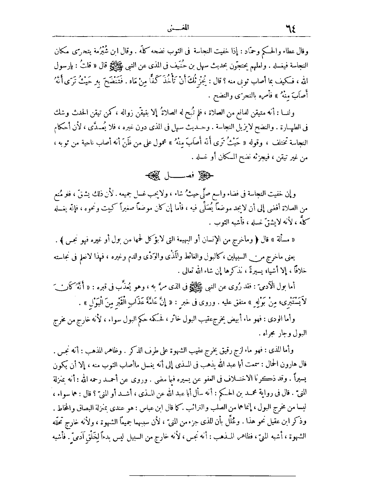 وَلَعَلَّهُمْ يَحْتَجُّونَ بِحَدِيثِ سَهْلِ بْنِ حُنَيْفٍ فِي الْمَذْيِ عَنْ النَّبِيِّ - صَلَّى اللَّهُ عَلَيْهِ وَسَلَّمَ - قَالَ: قُلْت يَا رَسُولَ اللَّهِ فَكَيْفَ بِمَا أَصَابَ ثَوْبِي مِنْهُ؟ قَالَ: «يُجْزِئُكَ أَنْ تَأْخُذَ كَفًّا مِنْ مَاءٍ، فَتَنْضَحَ بِهِ حَيْثُ تَرَى أَنَّهُ أَصَابَ مِنْهُ.» فَأَمَرَهُ بِالتَّحَرِّي وَالنَّضْحِ. وَلَنَا، أَنَّهُ مُتَيَقَّنٌ لِلْمَانِعِ مِنْ الصَّلَاةِ. فَلَمْ تُبَحْ لَهُ الصَّلَاةُ إلَّا بِتَيَقُّنِ زَوَالِهِ كَمَنْ تَيَقَّنَ الْحَدَثَ وَشَكَّ فِي الطَّهَارَةِ، وَالنَّضْحُ لَا يُزِيلُ النَّجَاسَةَ، وَحَدِيثُ سَهْلٍ فِي الْمَذْيِ دُونَ غَيْرِهِ، فَلَا يُعَدَّى، لِأَنَّ أَحْكَامَ النَّجَاسَةِ تَخْتَلِفُ.