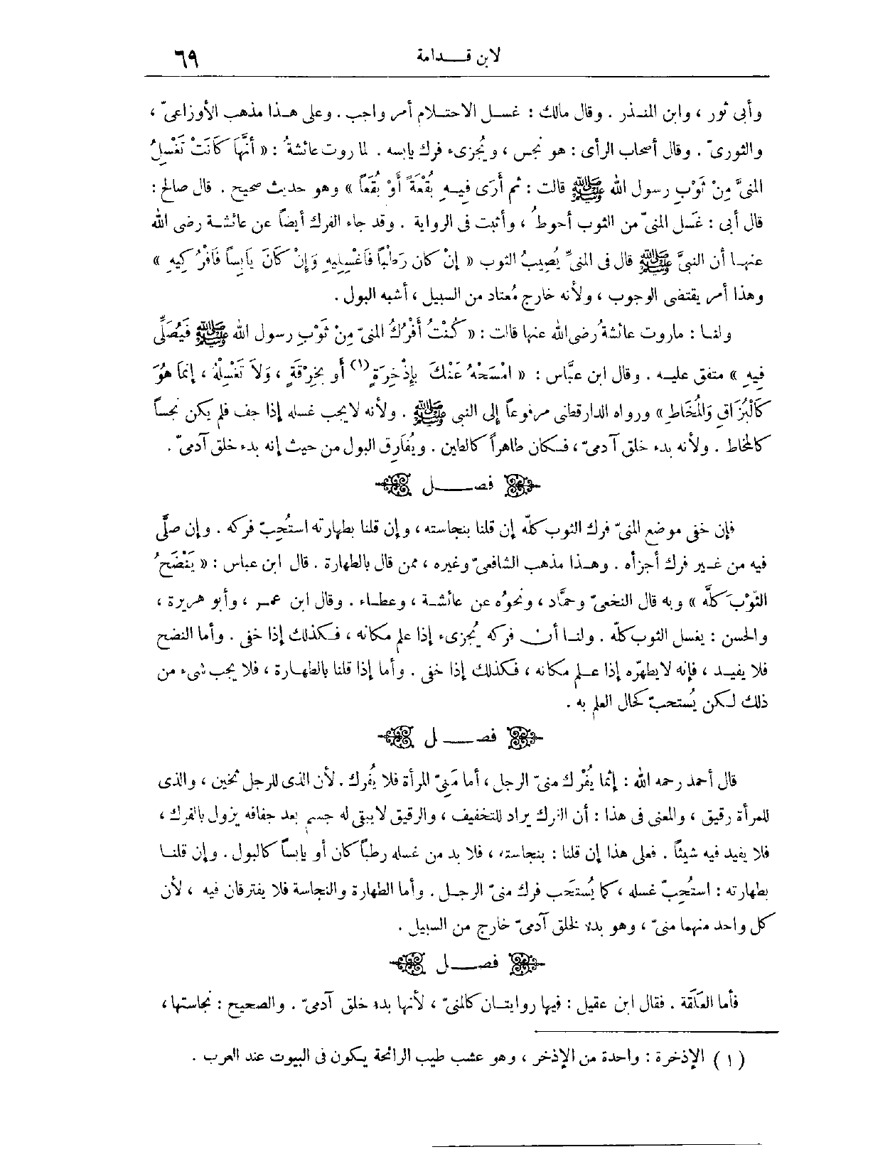 فَصْلٌ: قَالَ أَحْمَدُ - رَحِمَهُ اللَّهُ -: إنَّمَا يُفْرَكُ مَنِيُّ الرَّجُلِ، أَمَّا مَنِيُّ الْمَرْأَةِ فَلَا يُفْرَكُ؛ لِأَنَّ الَّذِي لِلرَّجُلِ ثَخِينٌ، وَاَلَّذِي لِلْمَرْأَةِ رَقِيقٌ. وَالْمَعْنَى فِي هَذَا أَنَّ الْفَرْكَ يُرَادُ لِلتَّخْفِيفِ وَالرَّقِيقُ لَا يَبْقَى لَهُ جِسْمٌ بَعْدَ جَفَافِهِ يَزُولُ بِالْفَرْكِ، فَلَا يُفِيدُ فِيهِ شَيْئًا، فَعَلَى هَذَا إنْ قُلْنَا بِنَجَاسَتِهِ، فَلَا بُدَّ مِنْ غَسْلِهِ رَطْبًا كَانَ أَوْ يَابِسًا، كَالْبَوْلِ. وَإِنْ قُلْنَا بِطَهَارَتِهِ، اُسْتُحِبَّ غَسْلُهُ، كَمَا يُسْتَحَبُّ فَرْكُ مَنِيِّ الرَّجُلِ.