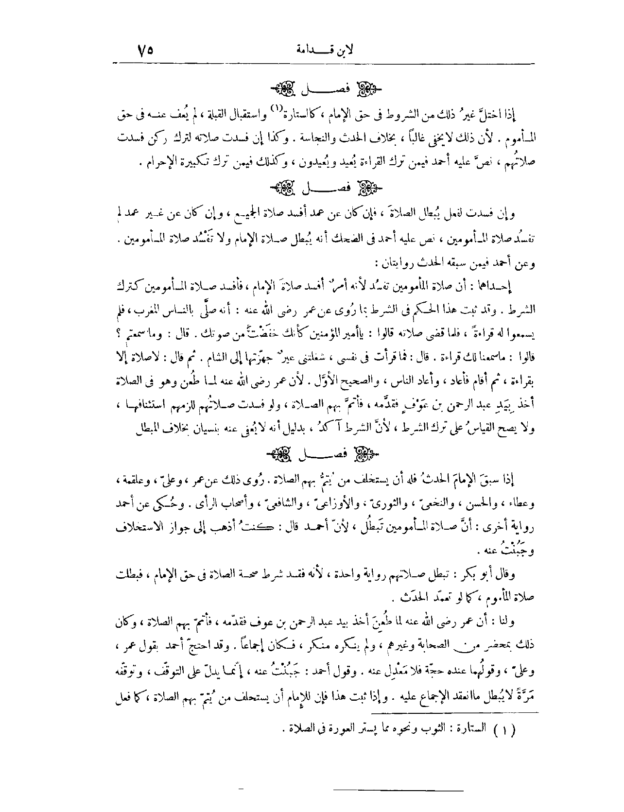 (١٠٠٦) فَصْلٌ: إذَا اخْتَلَّ غَيْرُ ذَلِكَ مِنْ الشُّرُوطِ فِي حَقِّ الْإِمَامِ، كَالسِّتَارَةِ وَاسْتِقْبَالِ الْقِبْلَةِ، لَمْ يُعْفَ عَنْهُ فِي حَقِّ الْمَأْمُومِ؛ لِأَنَّ ذَلِكَ لَا يَخْفَى غَالِبًا، بِخِلَافِ الْحَدَثِ وَالنَّجَاسَةِ. وَكَذَا إنْ فَسَدَتْ صَلَاتُهُ لِتَرْكِ رُكْنٍ، فَسَدَتْ صَلَاتُهُمْ. نَصَّ عَلَيْهِ أَحْمَدُ، فِي مَنْ تَرَكَ الْقِرَاءَةَ، يُعِيدُ وَيُعِيدُونَ، وَكَذَلِكَ فِي مَنْ تَرَكَ تَكْبِيرَةَ الْإِحْرَامِ. (١٠٠٧) فَصْلٌ: وَإِنْ فَسَدَتْ لِفِعْلٍ يُبْطِلُ الصَّلَاةَ، فَإِنْ كَانَ عَنْ عَمْدٍ، أَفْسَدَ صَلَاةَ الْجَمِيعِ، وَإِنْ كَانَ عَنْ غَيْرِ عَمْدٍ، لَمْ تَفْسُدْ صَلَاةُ الْمَأْمُومِينَ.
