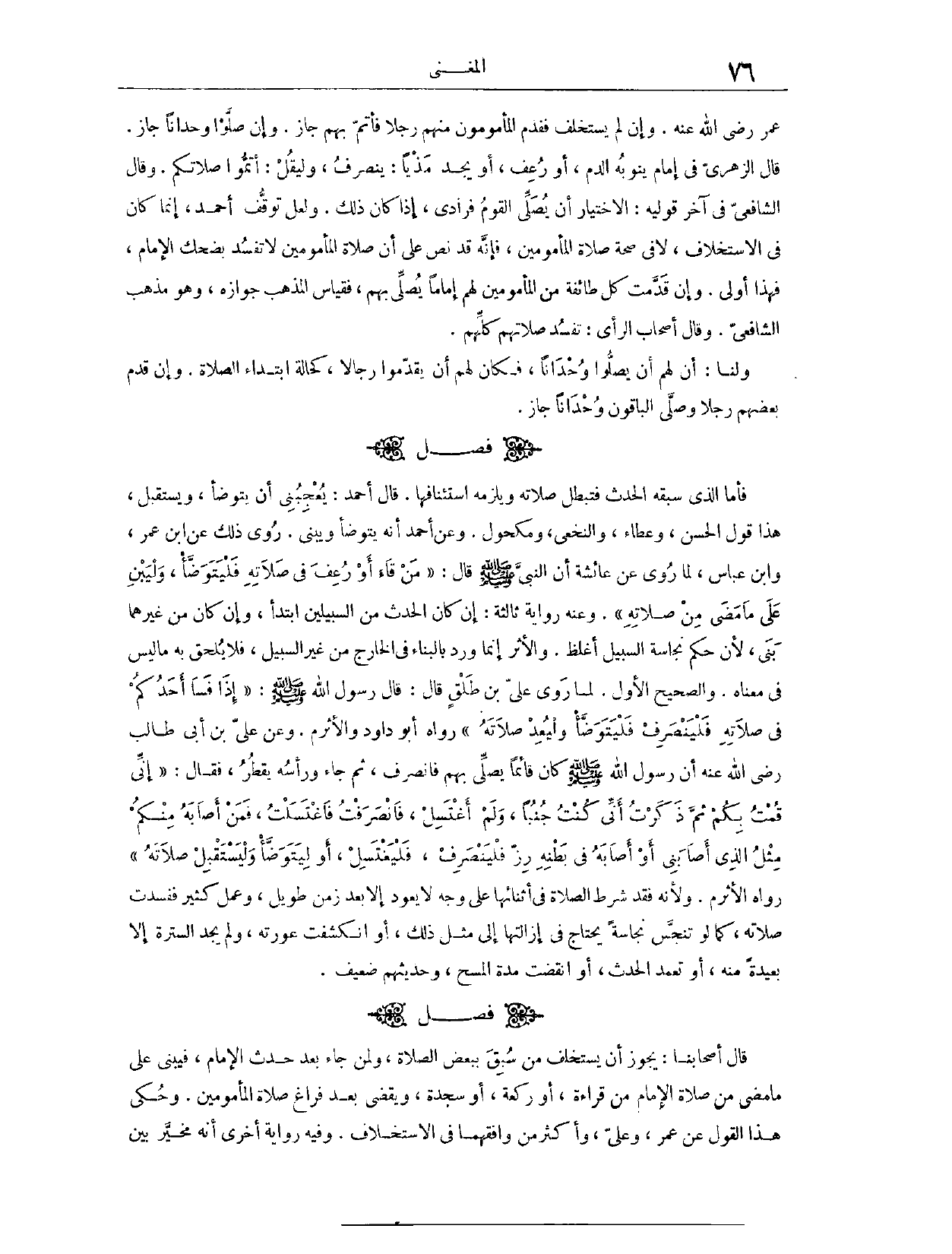 عُمَرُ - رَضِيَ اللَّهُ عَنْهُ - وَإِنْ لَمْ يَسْتَخْلِفْ فَقَدَّمَ الْمَأْمُومُونَ مِنْهُمْ رَجُلًا فَأَتَمَّ بِهِمْ، جَازَ. وَإِنْ صَلَّوْا وُحْدَانًا جَازَ. قَالَ الزُّهْرِيُّ، فِي إمَامٍ يَنُوبُهُ الدَّمُ أَوْ رَعَفَ أَوْ يَجِدُ مَذْيًا يَنْصَرِفُ، وَلْيَقُلْ: أَتِمُّوا صَلَاتَكُمْ. وَقَالَ الشَّافِعِيُّ، فِي آخِرِ قَوْلَيْهِ: الِاخْتِيَارُ أَنْ يُصَلِّيَ الْقَوْمُ فُرَادَى إذَا كَانَ ذَلِكَ. وَلَعَلَّ تَوَقُّفَ أَحْمَدَ إنَّمَا كَانَ فِي الِاسْتِخْلَافِ، لَا فِي صِحَّةِ صَلَاةِ الْمَأْمُومِينَ، فَإِنَّهُ قَدْ نَصَّ عَلَى أَنَّ صَلَاةَ الْمَأْمُومِينَ لَا تَفْسُدُ بِضَحِكِ الْإِمَامِ، فَهَذَا أَوْلَى.