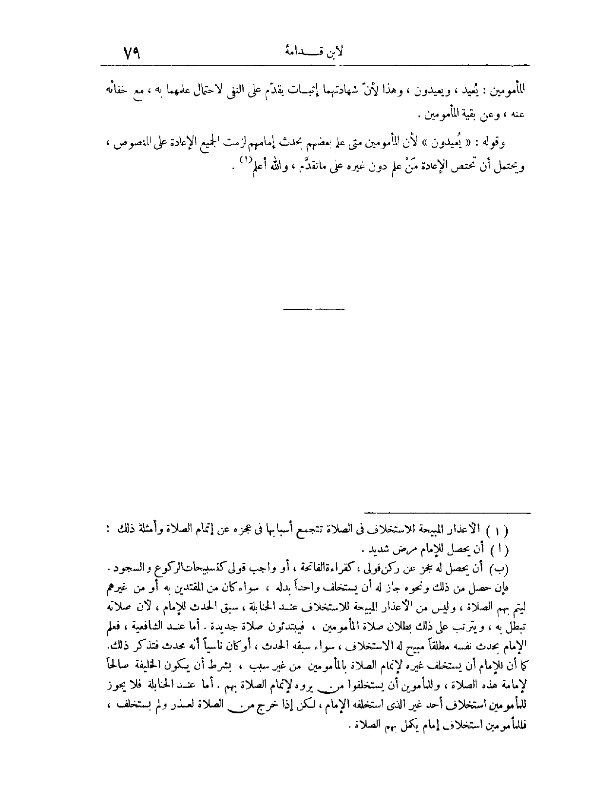 الْمَأْمُومِينَ: يُعِيدُ، وَيُعِيدُونَ. وَهَذَا لِأَنَّ شَهَادَتَهُمَا إثْبَاتٌ يُقَدَّمُ عَلَى النَّفْيِ، لِاحْتِمَالِ عِلْمِهِمَا بِهِ، مَعَ خَفَائِهِ عَنْهُ وَعَنْ بَقِيَّةِ الْمَأْمُومِينَ. وَقَوْلُهُ: " يُعِيدُونَ ". لِأَنَّ الْمَأْمُومِينَ مَتَى عَلِمَ بَعْضُهُمْ بِحَدَثِ إمَامِهِمْ، لَزِمَتْ الْجَمِيعَ الْإِعَادَةُ عَلَى الْمَنْصُوصِ. وَيَحْتَمِلُ أَنَّهُ تَخْتَصُّ الْإِعَادَةُ مَنْ عَلِمَ دُونَ غَيْرِهِ عَلَى مَا تَقَدَّمَ. وَاَللَّهُ أَعْلَمُ.