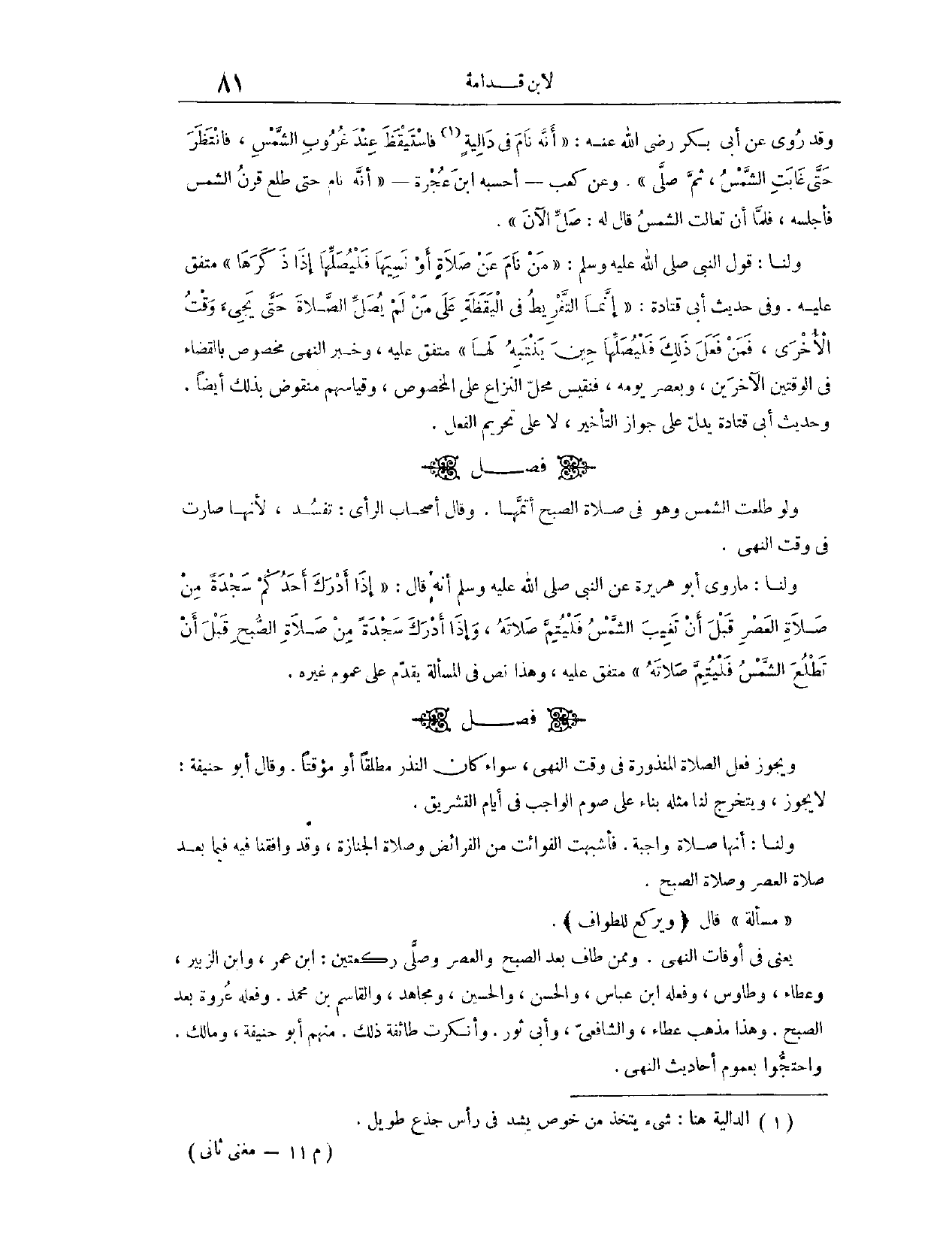 (١٠١٨) فَصْلٌ: وَيَجُوزُ فِعْلُ الصَّلَاةِ الْمَنْذُورَةِ فِي وَقْتِ النَّهْيِ، سَوَاءٌ كَانَ النَّذْرُ مُطْلَقًا أَوْ مُؤَقَّتًا. وَقَالَ أَبُو حَنِيفَةَ: لَا يَجُوزُ، وَيَتَخَرَّجُ لَنَا مِثْلُهُ بِنَاءً عَلَى صَوْمِ الْوَاجِبِ فِي أَيَّامِ التَّشْرِيقِ. وَلَنَا أَنَّهَا صَلَاةٌ وَاجِبَةٌ، فَأَشْبَهَتْ الْفَوَائِتَ مِنْ الْفَرَائِضِ وَصَلَاةَ الْجِنَازَةِ، وَقَدْ وَافَقَنَا فِيهِ فِيمَا بَعْدَ صَلَاةِ الْعَصْرِ وَصَلَاةِ الصُّبْحِ.