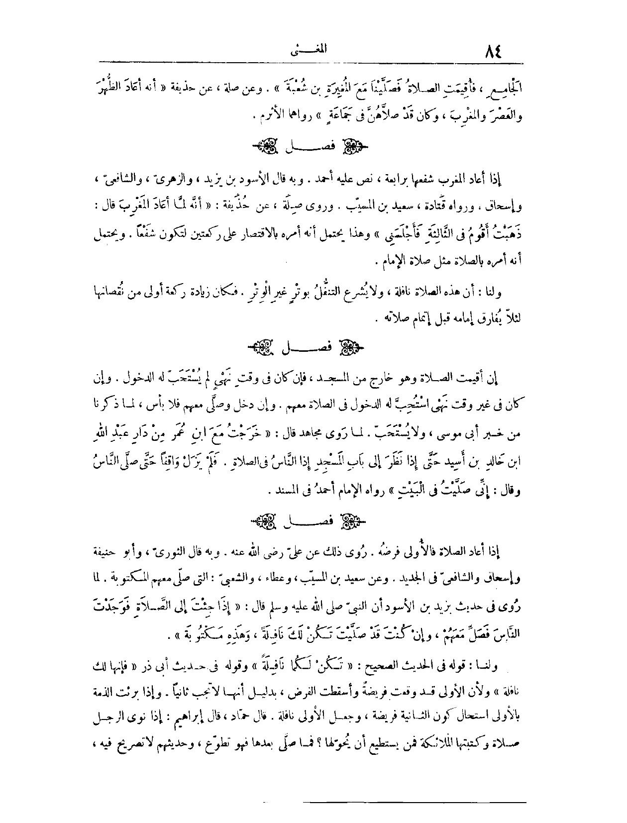 الْجَامِعِ، فَأُقِيمَتْ الصَّلَاةُ، فَصَلَّيْنَا مَعَ الْمُغِيرَةِ بْنِ شُعْبَةَ. وَعَنْ صِلَةَ، عَنْ حُذَيْفَةَ: أَنَّهُ أَعَادَ الظُّهْرَ وَالْعَصْرَ وَالْمَغْرِبَ، وَكَانَ قَدْ صَلَّاهُنَّ فِي جَمَاعَةٍ. رَوَاهُمَا الْأَثْرَمُ.