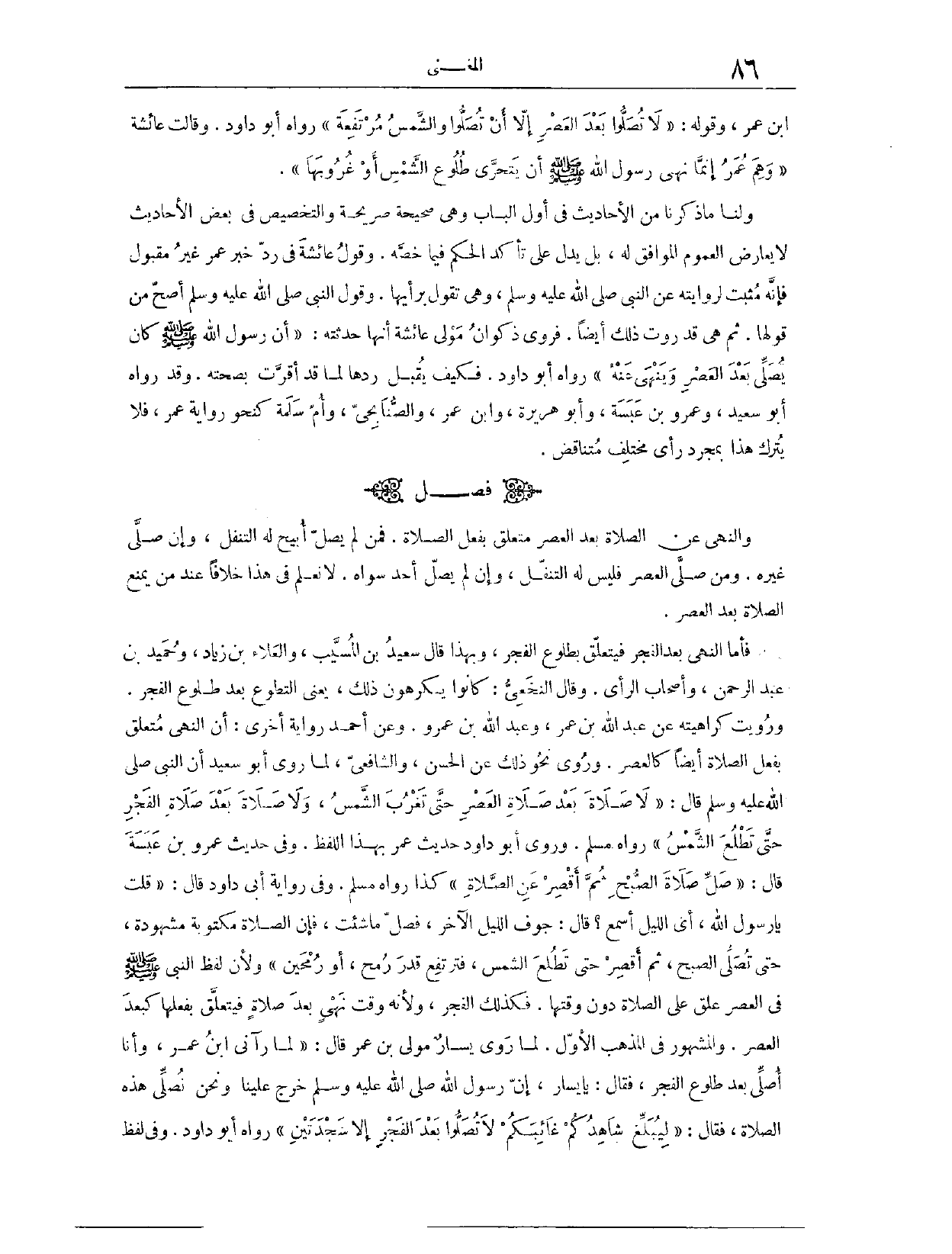 وَقَوْلُهُ: «لَا تُصَلُّوا بَعْدَ الْعَصْرِ إلَّا أَنْ تُصَلُّوا وَالشَّمْسُ مُرْتَفِعَةٌ» . رَوَاهُ أَبُو دَاوُد. وَقَالَتْ عَائِشَةُ: وَهِمَ عُمَرُ إنَّمَا نَهَى رَسُولُ اللَّهِ - صَلَّى اللَّهُ عَلَيْهِ وَسَلَّمَ - أَنْ يُتَحَرَّى طُلُوعُ الشَّمْسِ أَوْ غُرُوبُهَا. وَلَنَا مَا ذَكَرْنَا مِنْ الْأَحَادِيثِ فِي أَوَّلِ الْبَابِ، وَهِيَ صَحِيحَةٌ صَرِيحَةٌ، وَالتَّخْصِيصُ فِي بَعْضِ الْأَحَادِيثِ لَا يُعَارِضُ الْعُمُومَ الْمُوَافِقَ لَهُ، بَلْ يَدُلُّ عَلَى تَأَكُّدِ الْحُكْمِ فِيمَا خَصَّهُ، وَقَوْلُ عَائِشَةَ فِي رَدِّ خَبَرِ عُمَرَ غَيْرُ مَقْبُولٍ، فَإِنَّهُ مُثْبِتٌ لِرِوَايَتِهِ عَنْ النَّبِيِّ - صَلَّى اللَّهُ عَلَيْهِ وَسَلَّمَ - وَهِيَ تَقُولُ بِرَأْيِهَا، وَقَوْلُ النَّبِيِّ - صَلَّى اللَّهُ عَلَيْهِ وَسَلَّمَ - أَصَحُّ مِنْ قَوْلِهَا، ثُمَّ هِيَ قَدْ رَوَتْ ذَلِكَ أَيْضًا، فَرَوَى ذَكْوَانُ مَوْلَى عَائِشَةَ، أَنَّهَا حَدَّثَتْهُ، «أَنَّ رَسُولَ اللَّهِ - صَلَّى اللَّهُ عَلَيْهِ وَسَلَّمَ - كَانَ يُصَلِّي بَعْدَ الْعَصْرِ، وَيَنْهَى عَنْهُ» . رَوَاهُ أَبُو دَاوُد، فَكَيْفَ يُقْبَلُ رَدُّهَا لِمَا قَدْ أَقَرَّتْ بِصِحَّتِهِ، وَقَدْ رَوَاهُ أَبُو سَعِيدٍ، وَعَمْرُو بْنُ عَبَسَةَ، وَأَبُو هُرَيْرَةَ، وَابْنُ عُمَرَ، وَالصُّنَابِحِيُّ، وَأُمُّ سَلَمَةَ، كَنَحْوِ رِوَايَةِ عُمَرَ، فَلَا يُتْرَكُ هَذَا بِمُجَرَّدِ رَأْيٍ مُخْتَلِفٍ مُتَنَاقِضٍ.