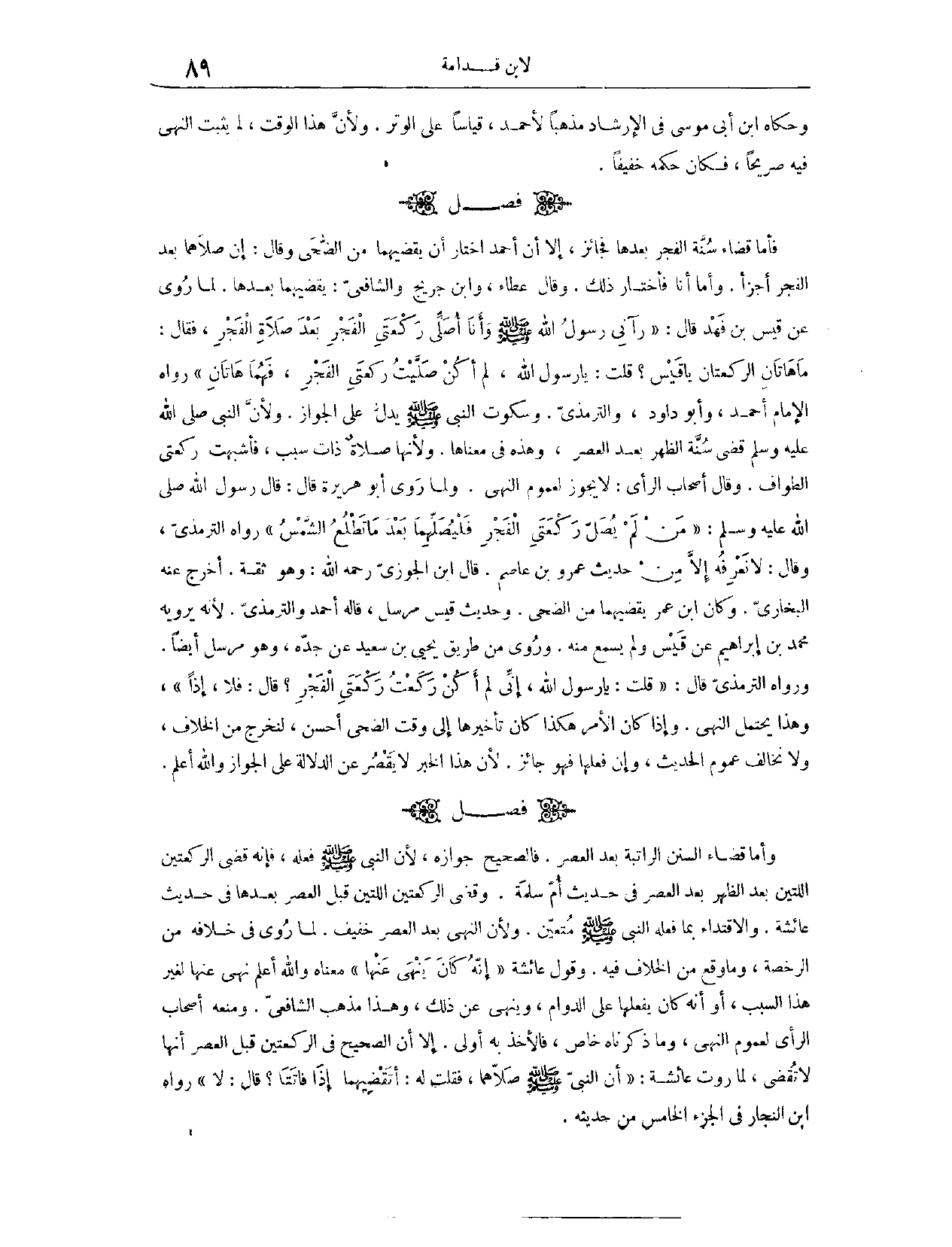 (١٠٣٠) فَصْلٌ: فَأَمَّا قَضَاءُ سُنَّةِ الْفَجْرِ بَعْدَهَا فَجَائِزٌ، إلَّا أَنَّ أَحْمَدَ اخْتَارَ أَنْ يَقْضِيَهُمَا مِنْ الضُّحَى، وَقَالَ: إنْ صَلَّاهُمَا بَعْدَ الْفَجْرِ أَجْزَأَ، وَأَمَّا أَنَا فَأَخْتَارُ ذَلِكَ. وَقَالَ عَطَاءٌ، وَابْنُ جُرَيْجٍ، وَالشَّافِعِيُّ: يَقْضِيهِمَا بَعْدَهَا؛ لِمَا رُوِيَ عَنْ قَيْسِ بْنِ فَهْدٍ، قَالَ: «رَآنِي رَسُولُ اللَّهِ - صَلَّى اللَّهُ عَلَيْهِ وَسَلَّمَ - وَأَنَا أُصَلِّي رَكْعَتَيْ الْفَجْرِ بَعْدَ صَلَاةِ الْفَجْرِ، فَقَالَ: مَا هَاتَانِ الرَّكْعَتَانِ يَا قَيْسُ؟ . قُلْت: يَا رَسُولَ اللَّهِ لَمْ أَكُنْ صَلَّيْت رَكْعَتَيْ الْفَجْرِ، فَهُمَا هَاتَانِ» . رَوَاهُ الْإِمَامُ أَحْمَدُ، وَأَبُو دَاوُد، وَالتِّرْمِذِيُّ. وَسُكُوتُ النَّبِيِّ - صَلَّى اللَّهُ عَلَيْهِ وَسَلَّمَ - يَدُلُّ عَلَى الْجَوَازِ، وَلِأَنَّ النَّبِيَّ - صَلَّى اللَّهُ عَلَيْهِ وَسَلَّمَ - قَضَى سُنَّةَ الظُّهْرِ بَعْدَ الْعَصْرِ، وَهَذِهِ فِي مَعْنَاهَا، وَلِأَنَّهَا صَلَاةٌ ذَاتُ سَبَبٍ، فَأَشْبَهَتْ رَكْعَتَيْ الطَّوَافِ. وَقَالَ أَصْحَابُ الرَّأْيِ: لَا يَجُوزُ؛ لِعُمُومِ النَّهْيِ، وَلِمَا رَوَى أَبُو هُرَيْرَةَ قَالَ: قَالَ رَسُولُ اللَّهِ - صَلَّى اللَّهُ عَلَيْهِ وَسَلَّمَ -: «مَنْ لَمْ يُصَلِّ رَكْعَتَيْ الْفَجْرِ فَلْيُصَلِّهِمَا بَعْدَمَا تَطْلُعُ الشَّمْسُ» . رَوَاهُ التِّرْمِذِيُّ، وَقَالَ: لَا نَعْرِفُهُ إلَّا مِنْ حَدِيثِ عَمْرِو بْنِ عَاصِمٍ. قَالَ ابْنُ الْجَوْزِيِّ، - رَحِمَهُ اللَّهُ -: وَهُوَ ثِقَةٌ، أَخْرَجَ عَنْهُ الْبُخَارِيُّ. وَكَانَ ابْنُ عُمَرَ يَقْضِيهِمَا مِنْ الضُّحَى، وَحَدِيثُ قَيْسٍ مُرْسَلٌ، قَالَهُ أَحْمَدُ، وَالتِّرْمِذِيُّ، لِأَنَّهُ يَرْوِيهِ مُحَمَّدُ بْنُ إبْرَاهِيمَ عَنْ قَيْسٍ، وَلَمْ يَسْمَعْ مِنْهُ، وَرُوِيَ مِنْ طَرِيقِ يَحْيَى بْنِ سَعِيدٍ عَنْ جَدِّهِ، وَهُوَ مُرْسَلٌ أَيْضًا، وَرَوَاهُ التِّرْمِذِيُّ، قَالَ: «قُلْت يَا رَسُولَ اللَّهِ: إنِّي لَمْ أَكُنْ رَكَعْت رَكْعَتَيْ الْفَجْرِ. قَالَ: فَلَا إذًا» .