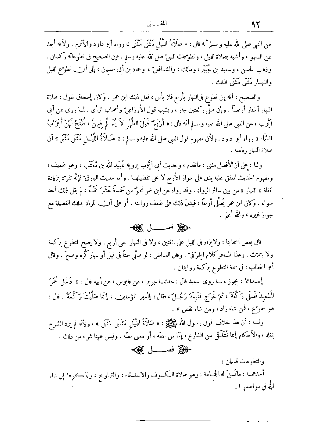 عَنْ النَّبِيِّ - صَلَّى اللَّهُ عَلَيْهِ وَسَلَّمَ - أَنَّهُ قَالَ: «صَلَاةُ اللَّيْلِ وَالنَّهَارِ مَثْنَى مَثْنَى» . رَوَاهُ أَبُو دَاوُد، وَالْأَثْرَمُ. وَلِأَنَّهُ أَبْعَدُ عَنْ السَّهْوِ، وَأَشْبَهُ بِصَلَاةِ اللَّيْلِ، وَتَطَوُّعَاتِ النَّبِيِّ - صَلَّى اللَّهُ عَلَيْهِ وَسَلَّمَ - فَإِنَّ الصَّحِيحَ فِي تَطَوُّعَاتِهِ رَكْعَتَانِ. وَذَهَبَ الْحَسَنُ، وَسَعِيدُ بْنُ جُبَيْرٍ، وَمَالِكٌ، وَالشَّافِعِيُّ، وَحَمَّادُ بْنُ أَبِي سُلَيْمَانَ إلَى أَنَّ تَطَوُّعَ اللَّيْلِ وَالنَّهَارِ مَثْنَى مَثْنَى لِذَلِكَ.