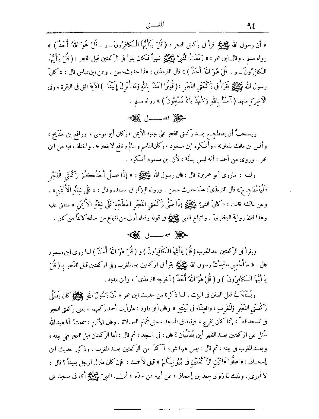 (١٠٤١) فَصْلٌ: وَيَقْرَأُ فِي الرَّكْعَتَيْنِ بَعْدَ الْمَغْرِبِ {قُلْ يَا أَيُّهَا الْكَافِرُونَ} [الكافرون: ١] وَ {قُلْ هُوَ اللَّهُ أَحَدٌ} [الإخلاص: ١] ؛ لِمَا رَوَى «ابْنُ مَسْعُودٍ، قَالَ: مَا أُحْصِي مَا سَمِعْتُ رَسُولَ اللَّهِ - صَلَّى اللَّهُ عَلَيْهِ وَسَلَّمَ - يَقْرَأُ فِي الرَّكْعَتَيْنِ بَعْدَ الْمَغْرِبِ، وَفِي الرَّكْعَتَيْنِ قَبْلَ الْفَجْرِ قُلْ يَا أَيُّهَا الْكَافِرُونَ وَ {قُلْ هُوَ اللَّهُ أَحَدٌ} [الإخلاص: ١] » . أَخْرَجَهُ التِّرْمِذِيُّ، وَابْنُ مَاجَهْ.