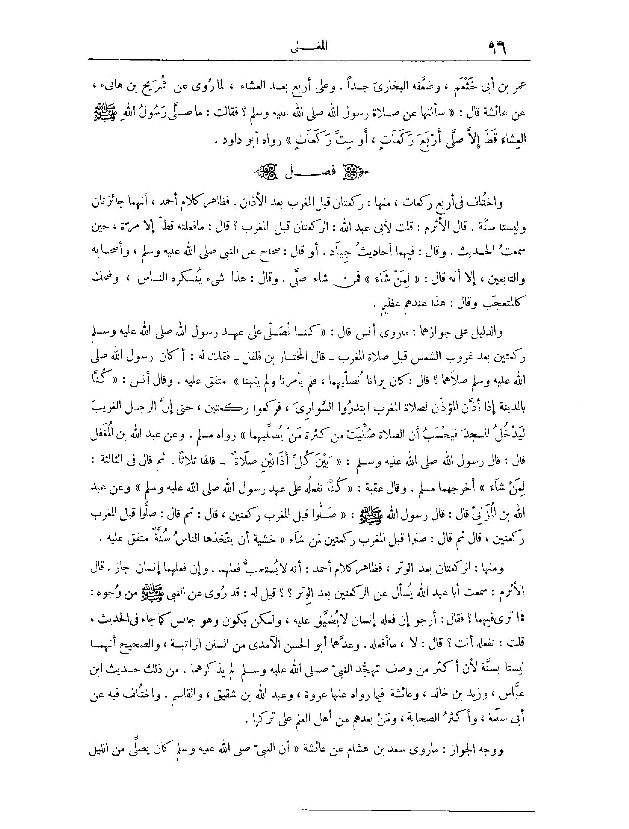 (١٠٤٣) فَصْلٌ: وَاخْتُلِفَ فِي أَرْبَعِ رَكَعَاتٍ، مِنْهَا رَكْعَتَانِ قَبْلَ الْمَغْرِبِ بَعْدَ الْأَذَانِ؛ فَظَاهِرُ كَلَامِ أَحْمَدَ، أَنَّهُمَا جَائِزَتَانِ وَلَيْسَتَا سُنَّةً. قَالَ الْأَثْرَمُ: قُلْت لِأَبِي عَبْدِ اللَّهِ، الرَّكْعَتَانِ قَبْلَ الْمَغْرِبِ؟ قَالَ: مَا فَعَلْته قَطُّ إلَّا مَرَّةً، حِينَ سَمِعْت الْحَدِيثَ، وَقَالَ: فِيهِمَا أَحَادِيثُ جِيَادٌ، أَوْ قَالَ: صِحَاحٌ، عَنْ النَّبِيِّ - صَلَّى اللَّهُ عَلَيْهِ وَسَلَّمَ - وَأَصْحَابِهِ وَالتَّابِعِينَ. إلَّا أَنَّهُ قَالَ: " لِمَنْ شَاءَ ". فَمَنْ شَاءَ صَلَّى. وَقَالَ: هَذَا شَيْءٌ يُنْكِرُهُ النَّاسُ. وَضَحِكَ كَالْمُتَعَجِّبِ، وَقَالَ: هَذَا عِنْدَهُمْ عَظِيمٌ. وَالدَّلِيلُ عَلَى جَوَازِهِمَا مَا رَوَى أَنَسٌ، قَالَ: «كُنَّا نُصَلِّي عَلَى عَهْدِ رَسُولِ اللَّهِ - صَلَّى اللَّهُ عَلَيْهِ وَسَلَّمَ - رَكْعَتَيْنِ بَعْدَ غُرُوبِ الشَّمْسِ قَبْلَ صَلَاةِ الْمَغْرِبِ. قَالَ الْمُخْتَارُ بْنُ فُلْفُلٍ: فَقُلْت لَهُ، أَكَانَ رَسُولُ اللَّهِ - صَلَّى اللَّهُ عَلَيْهِ وَسَلَّمَ - صَلَّاهُمَا؟ قَالَ: كَانَ يَرَانَا نُصَلِّيهِمَا، فَلَمْ يَأْمُرْنَا وَلَمْ يَنْهَنَا» . مُتَّفَقٌ عَلَيْهِ