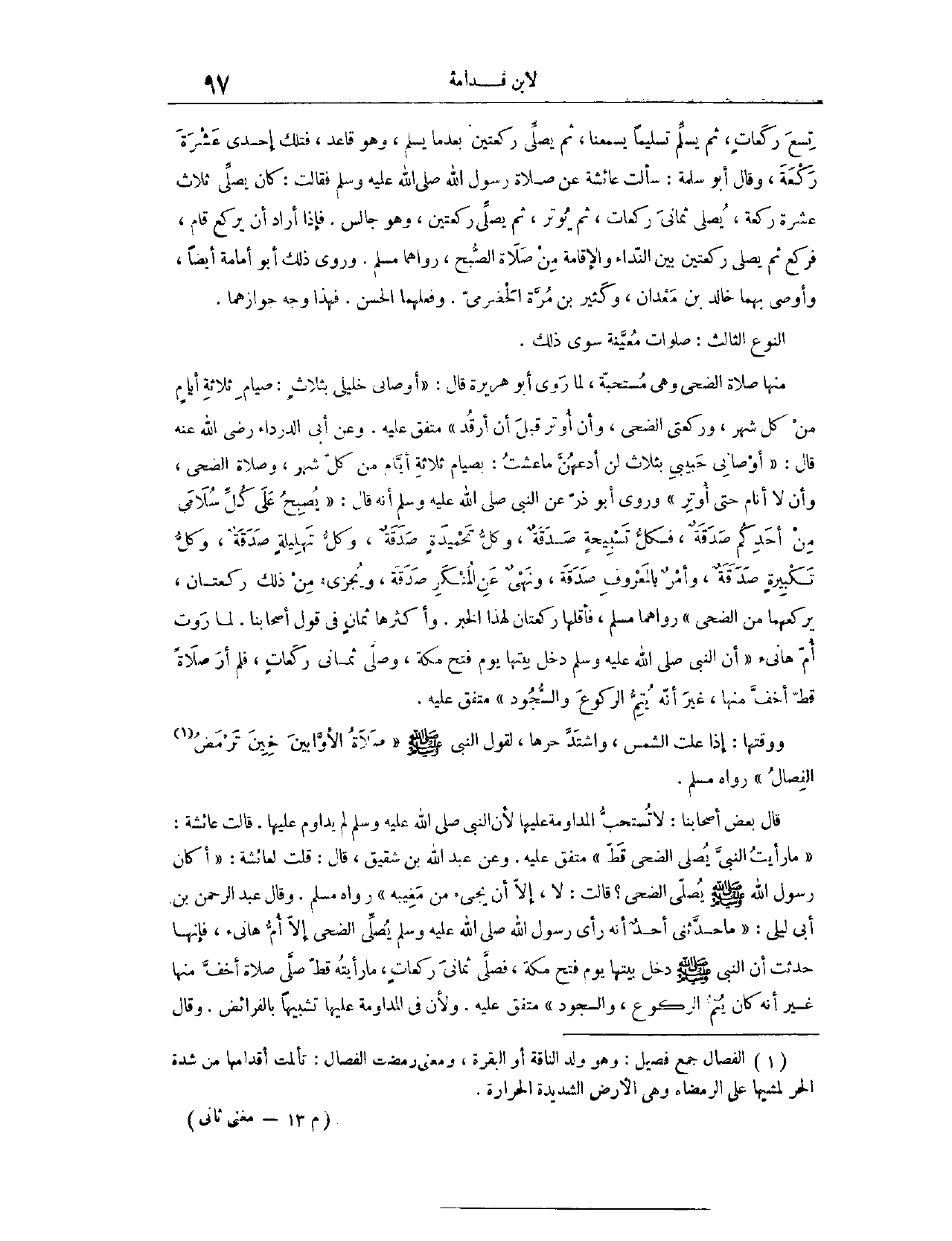 النَّوْعُ الثَّالِثُ: صَلَوَاتٌ مُعَيَّنَةٌ سِوَى ذَلِكَ، مِنْهَا صَلَاةُ الضُّحَى، وَهِيَ مُسْتَحَبَّةٌ؛ لِمَا رَوَى أَبُو هُرَيْرَةَ قَالَ: «أَوْصَانِي خَلِيلِي بِثَلَاثٍ: صِيَامِ ثَلَاثَةِ أَيَّامٍ مِنْ كُلِّ شَهْرٍ، وَرَكْعَتَيْ الضُّحَى، وَأَنْ أُوتِرَ قَبْلَ أَنْ أَرْقُدَ» . مُتَّفَقٌ عَلَيْهِ. وَعَنْ أَبِي الدَّرْدَاءِ - رَضِيَ اللَّهُ عَنْهُ - قَالَ: «أَوْصَانِي حَبِيبِي بِثَلَاثٍ لَنْ أَدَعَهُنَّ مَا عِشْت: بِصِيَامِ ثَلَاثَةِ أَيَّامٍ مِنْ كُلّ شَهْرٍ، وَصَلَاةِ الضُّحَى، وَأَنْ لَا أَنَامَ حَتَّى أُوتِرَ» . وَرَوَى أَبُو ذَرٍّ، عَنْ النَّبِيِّ - صَلَّى اللَّهُ عَلَيْهِ وَسَلَّمَ - أَنَّهُ قَالَ: «يُصْبِحُ عَلَى كُلِّ سُلَامَى مِنْ أَحَدِكُمْ صَدَقَةٌ، فَكُلُّ تَسْبِيحَةٍ صَدَقَةٌ، وَكُلُّ تَحْمِيدَةٍ صَدَقَةٌ، وَكُلُّ تَهْلِيلَةٍ صَدَقَةٌ، وَكُلُّ تَكْبِيرَةٍ صَدَقَةٌ، وَأَمْرٌ بِالْمَعْرُوفِ صَدَقَةٌ، وَنَهْيٌ عَنْ الْمُنْكَرِ صَدَقَةٌ، وَيُجْزِئُ مِنْ ذَلِكَ رَكْعَتَانِ يَرْكَعُهُمَا مِنْ الضُّحَى» . رَوَاهُمَا مُسْلِمٌ.