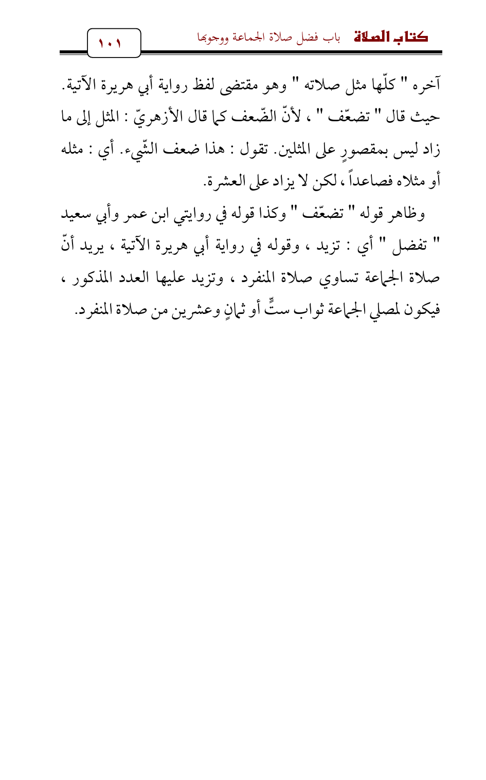 وظاهر قوله " تضعّف " وكذا قوله في روايتي ابن عمر وأبي سعيد " تفضل " أي: تزيد، وقوله في رواية أبي هريرة الآتية , يريد أنّ صلاة الجماعة تساوي صلاة المنفرد , وتزيد عليها العدد المذكور , فيكون لمصلي الجماعة ثواب ستٍّ أو ثمانٍ وعشرين من صلاة المنفرد.