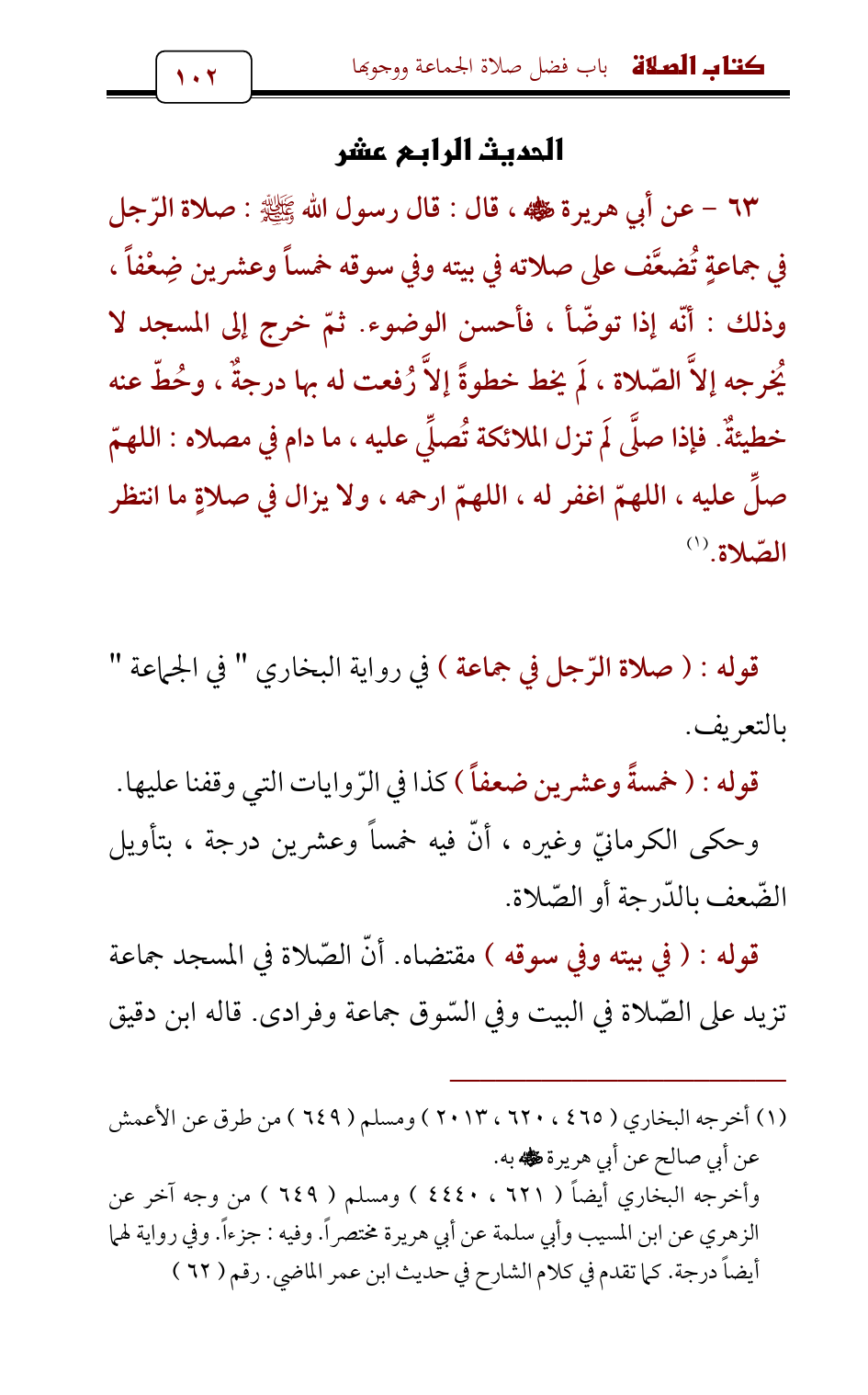 63 - عن أبي هريرة - رضي الله عنه - , قال: قال رسول الله - صلى الله عليه وسلم -: صلاة الرّجل في جماعةٍ تُضعَّف على صلاته في بيته وفي سوقه خمساً وعشرين ضِعْفاً , وذلك: أنّه إذا توضّأ , فأحسن الوضوء. ثمّ خرج إلى المسجد لا يُخرجه إلاَّ الصّلاة , لَم يخط خطوةً إلاَّ رُفعت له بها درجةٌ , وحُطّ عنه خطيئةٌ. فإذا صلَّى لَم تزل الملائكة تُصلِّي عليه , ما دام في مصلاه: اللهمّ صلِّ عليه , اللهمّ اغفر له , اللهمّ ارحمه , ولا يزال في صلاةٍ ما انتظر الصّلاة. (¬1)