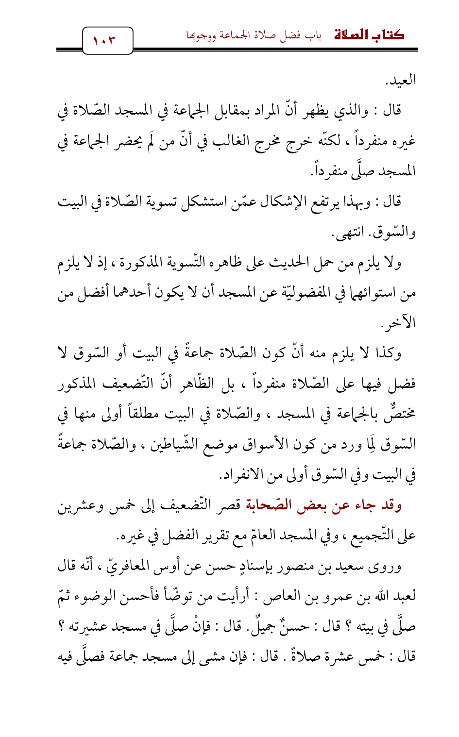 وروى سعيد بن منصور بإسنادٍ حسن عن أوس المعافريّ , أنّه قال لعبد الله بن عمرو بن العاص: أرأيت من توضّأ فأحسن الوضوء ثمّ صلَّى في بيته؟ قال: حسنٌ جميلٌ. قال: فإنْ صلَّى في مسجد عشيرته؟ قال: خمس عشرة صلاةً. قال: فإن مشى إلى مسجد جماعة فصلَّى فيه