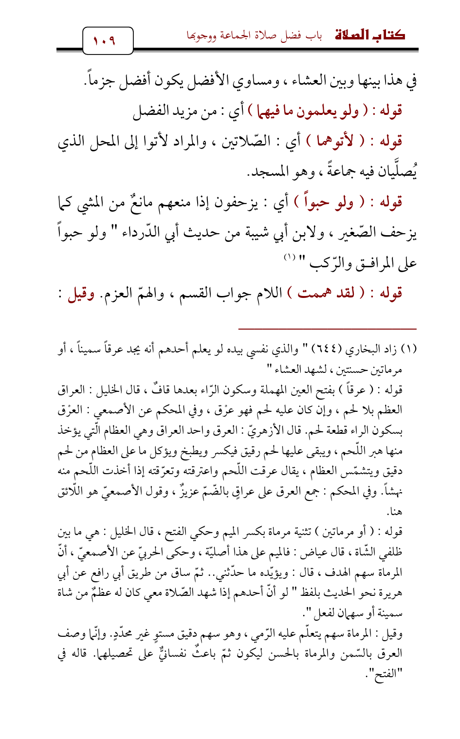 (¬1) زاد البخاري (644) " والذي نفسي بيده لو يعلم أحدهم أنه يجد عرقاً سميناً، أو مرماتين حسنتين، لشهد العشاء "