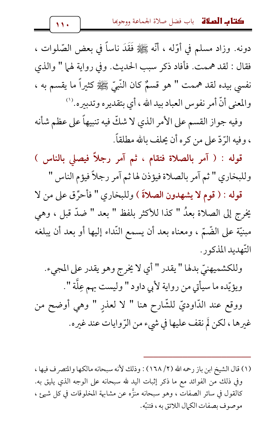 دونه. وزاد مسلم في أوّله , أنّه - صلى الله عليه وسلم - فَقَدَ ناساً في بعض الصّلوات , فقال: لقد هممت. فأفاد ذكر سبب الحديث. وفي رواية لهما " والذي نفسي بيده لقد هممت " هو قسمٌ كان النّبيّ - صلى الله عليه وسلم - كثيراً ما يقسم به، والمعنى أنّ أمر نفوس العباد بيد الله، أي بتقديره وتدبيره. (¬1)