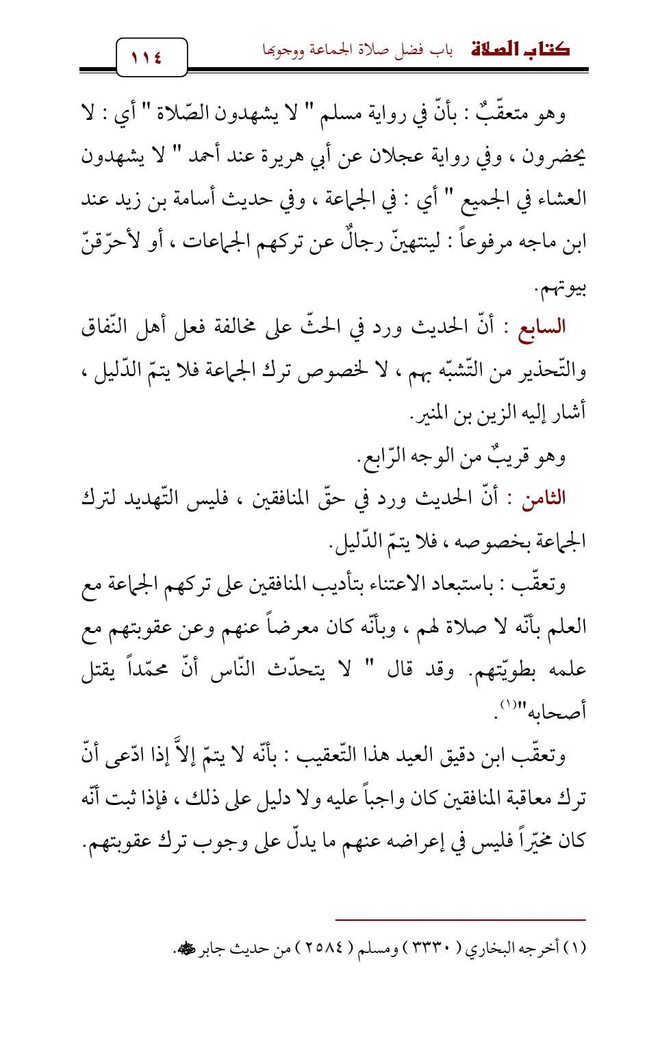 وتعقّب: باستبعاد الاعتناء بتأديب المنافقين على تركهم الجماعة مع العلم بأنّه لا صلاة لهم، وبأنّه كان معرضاً عنهم وعن عقوبتهم مع علمه بطويّتهم. وقد قال " لا يتحدّث النّاس أنّ محمّداً يقتل أصحابه " (¬1).