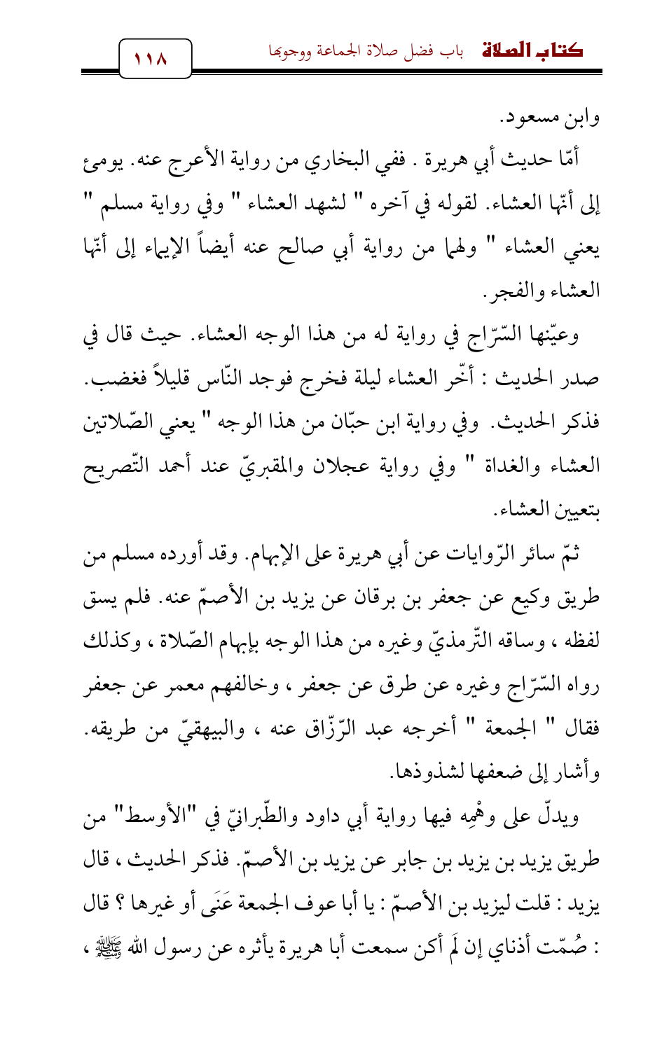 أمّا حديث أبي هريرة. ففي البخاري من رواية الأعرج عنه. يومئ إلى أنّها العشاء. لقوله في آخره " لشهد العشاء " وفي رواية مسلم " يعني العشاء " ولهما من رواية أبي صالح عنه أيضاً الإيماء إلى أنّها العشاء والفجر.