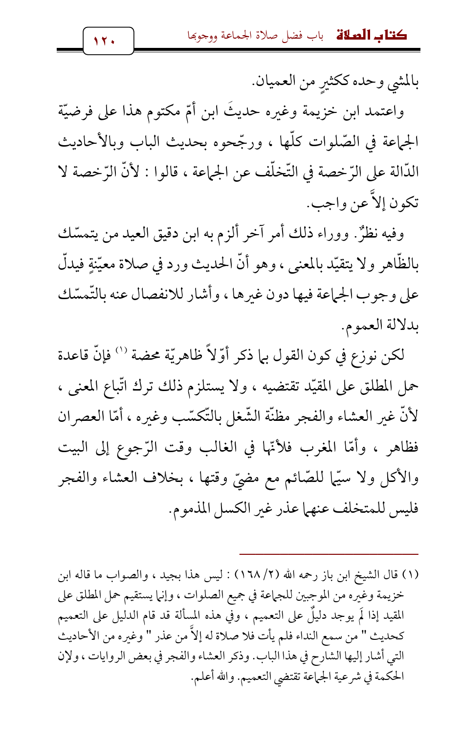 (¬1) قال الشيخ ابن باز رحمه الله (2/ 168): ليس هذا بجيد , والصواب ما قاله ابن خزيمة وغيره من الموجبين للجماعة في جميع الصلوات , وإنما يستقيم حمل المطلق على المقيد إذا لَم يوجد دليلٌ على التعميم , وفي هذه المسألة قد قام الدليل على التعميم كحديث " من سمع النداء فلم يأت فلا صلاة له إلاَّ من عذر " وغيره من الأحاديث التي أشار إليها الشارح في هذا الباب. وذكر العشاء والفجر في بعض الروايات , ولإن الحكمة في شرعية الجماعة تقتضي التعميم. والله أعلم.