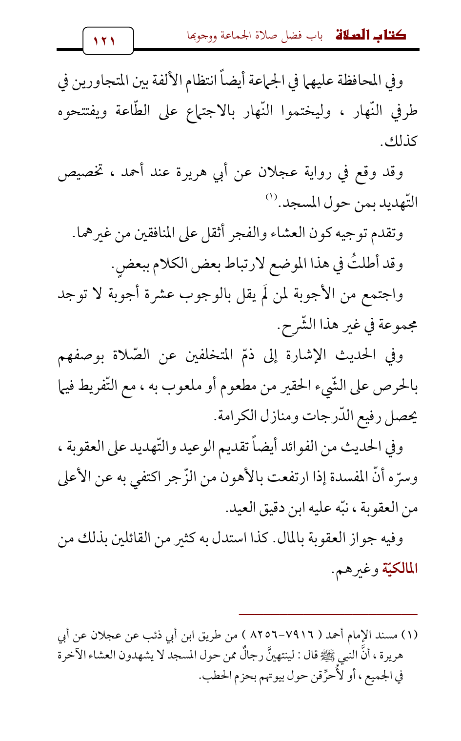 (¬1) مسند الإمام أحمد (7916 - 8256) من طريق ابن أبي ذئب عن عجلان عن أبي هريرة، أنَّ النبي - صلى الله عليه وسلم - قال: لينتهينَّ رجالٌ ممن حول المسجد لا يشهدون العشاء الآخرة في الجميع، أو لأُحرِّقن حول بيوتهم بحزم الحطب.