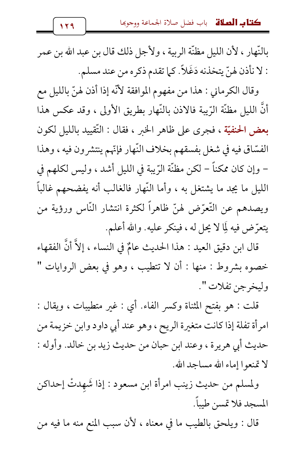 قال ابن دقيق العيد: هذا الحديث عامٌ في النساء، إلاَّ أنَّ الفقهاء خصوه بشروط: منها: أن لا تتطيب، وهو في بعض الروايات " وليخرجن تفلات ".