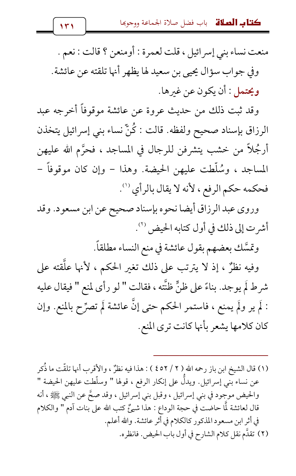 وقد ثبت ذلك من حديث عروة عن عائشة موقوفاً أخرجه عبد الرزاق بإسناد صحيح ولفظه. قالت: كُنَّّ نساء بني إسرائيل يتخذن أرجُلاً من خشب يتشرفن للرجال في المساجد، فحرَّم الله عليهن المساجد، وسُلّطت عليهن الحيضة. وهذا - وإن كان موقوفاً - فحكمه حكم الرفع , لأنه لا يقال بالرأي (¬1).