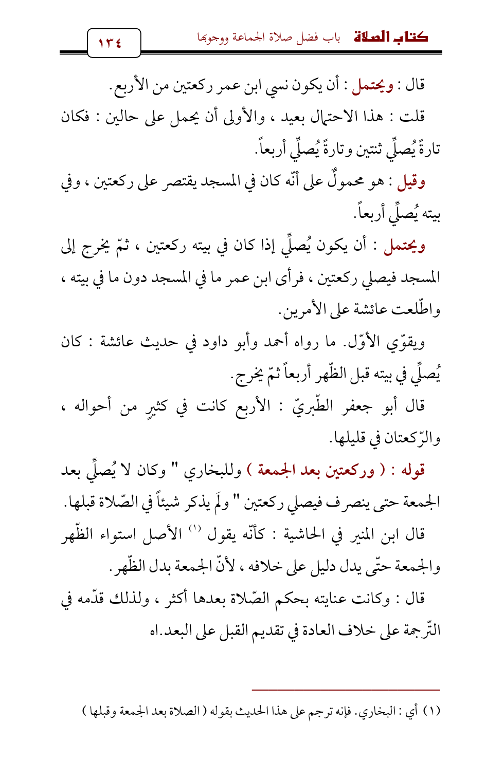 قلت: هذا الاحتمال بعيد، والأولى أن يحمل على حالين: فكان تارةً يُصلِّي ثنتين وتارةً يُصلِّي أربعاً.