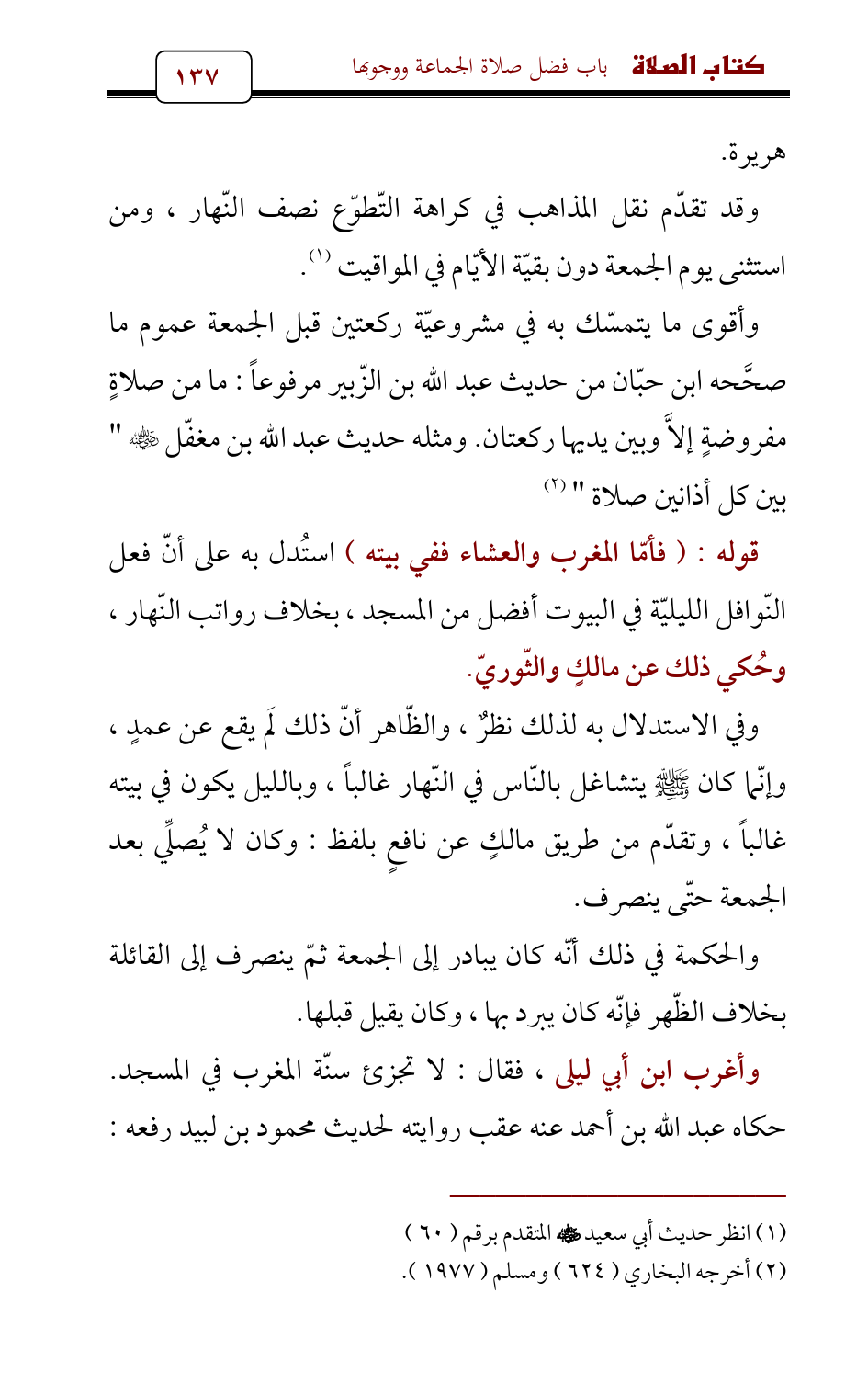 وأقوى ما يتمسّك به في مشروعيّة ركعتين قبل الجمعة عموم ما صحَّحه ابن حبّان من حديث عبد الله بن الزّبير مرفوعاً: ما من صلاةٍ مفروضةٍ إلاَّ وبين يديها ركعتان. ومثله حديث عبد الله بن مغفّل - رضي الله عنه - " بين كل أذانين صلاة " (¬2)