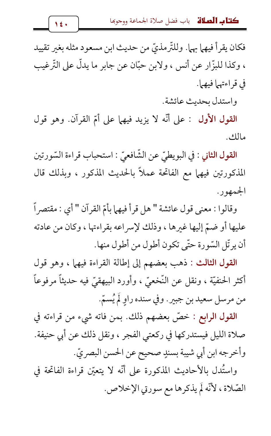 القول الرابع: خصّ بعضهم ذلك. بمن فاته شيء من قراءته في صلاة الليل فيستدركها في ركعتي الفجر، ونقل ذلك عن أبي حنيفة. وأخرجه ابن أبي شيبة بسندٍ صحيح عن الحسن البصريّ.