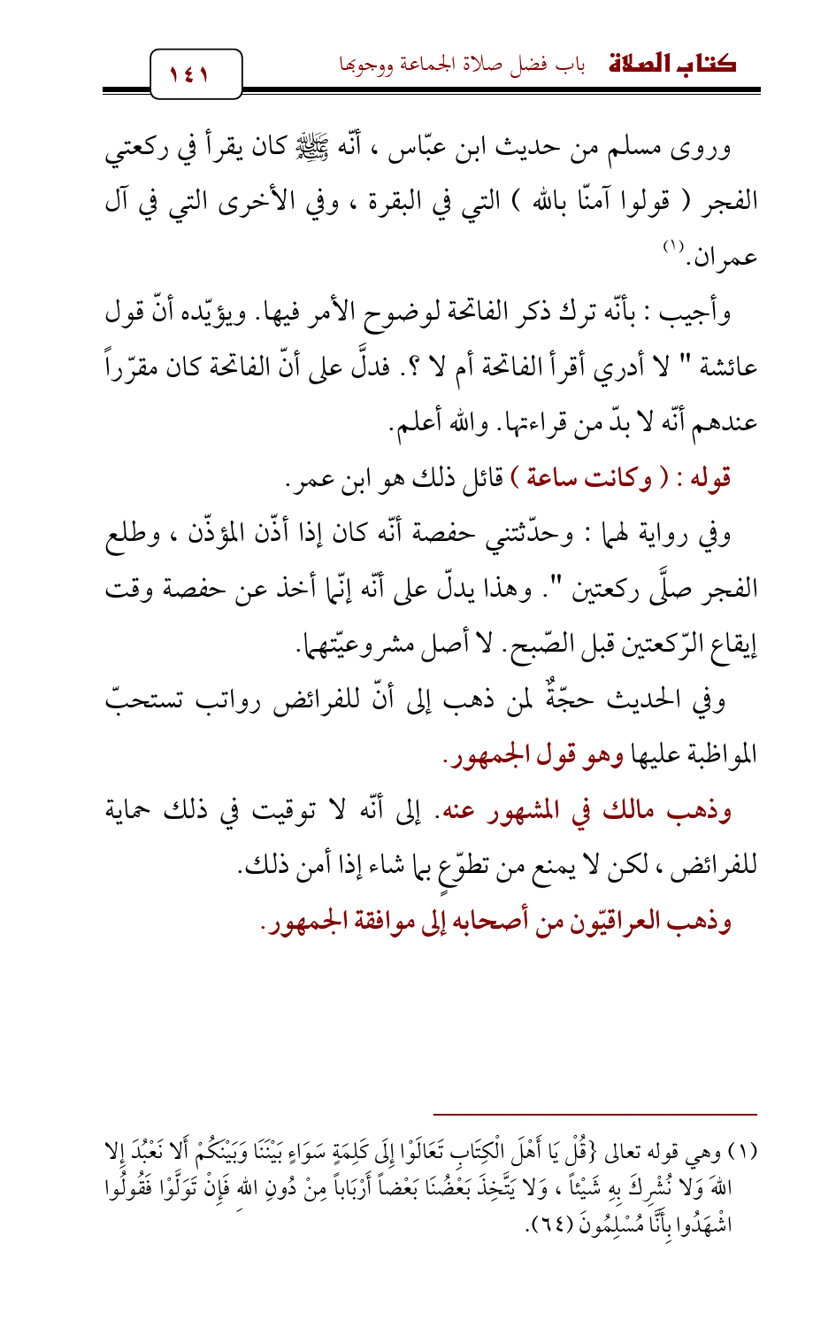 وروى مسلم من حديث ابن عبّاس , أنّه - صلى الله عليه وسلم - كان يقرأ في ركعتي الفجر (قولوا آمنّا بالله) التي في البقرة، وفي الأخرى التي في آل عمران. (¬1)