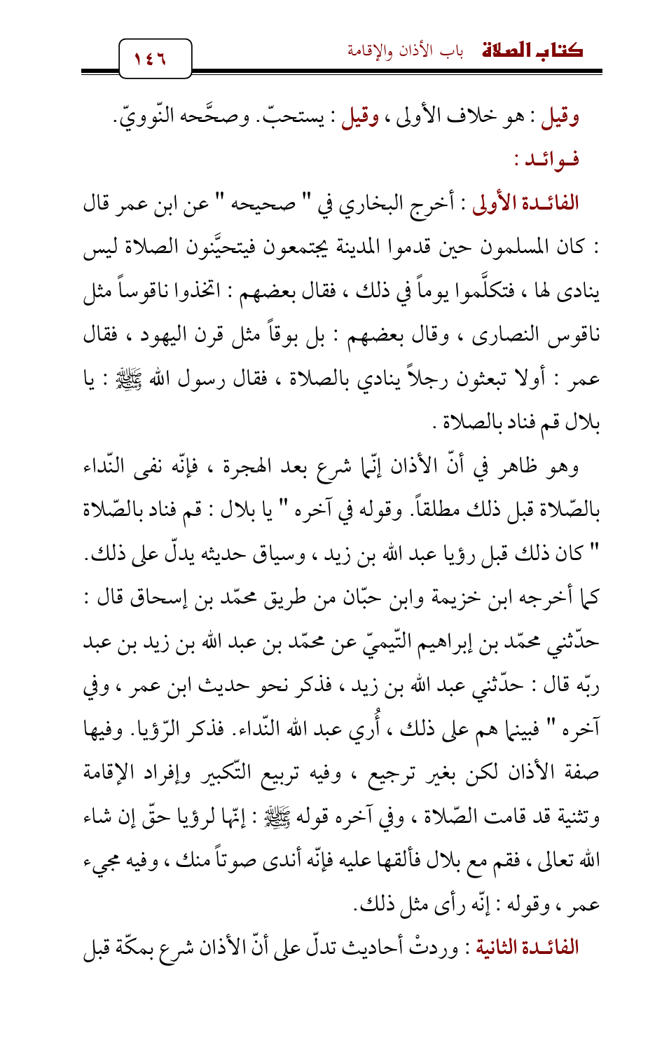 الفائدة الأولى: أخرج البخاري في " صحيحه " عن ابن عمر قال: كان المسلمون حين قدموا المدينة يجتمعون فيتحيَّنون الصلاة ليس ينادى لها، فتكلَّموا يوماً في ذلك، فقال بعضهم: اتخذوا ناقوساً مثل ناقوس النصارى، وقال بعضهم: بل بوقاً مثل قرن اليهود، فقال عمر: أولا تبعثون رجلاً ينادي بالصلاة، فقال رسول الله - صلى الله عليه وسلم -: يا بلال قم فناد بالصلاة.