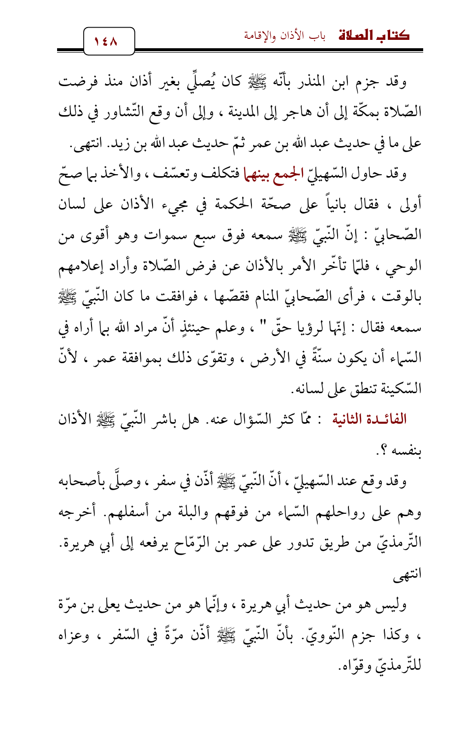 وقد وقع عند السّهيليّ , أنّ النّبيّ - صلى الله عليه وسلم - أذّن في سفر , وصلَّى بأصحابه وهم على رواحلهم السّماء من فوقهم والبلة من أسفلهم. أخرجه التّرمذيّ من طريق تدور على عمر بن الرّمّاح يرفعه إلى أبي هريرة. انتهى