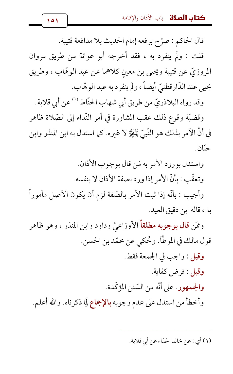 واستدل بورود الأمر به مَن قال بوجوب الأذان.