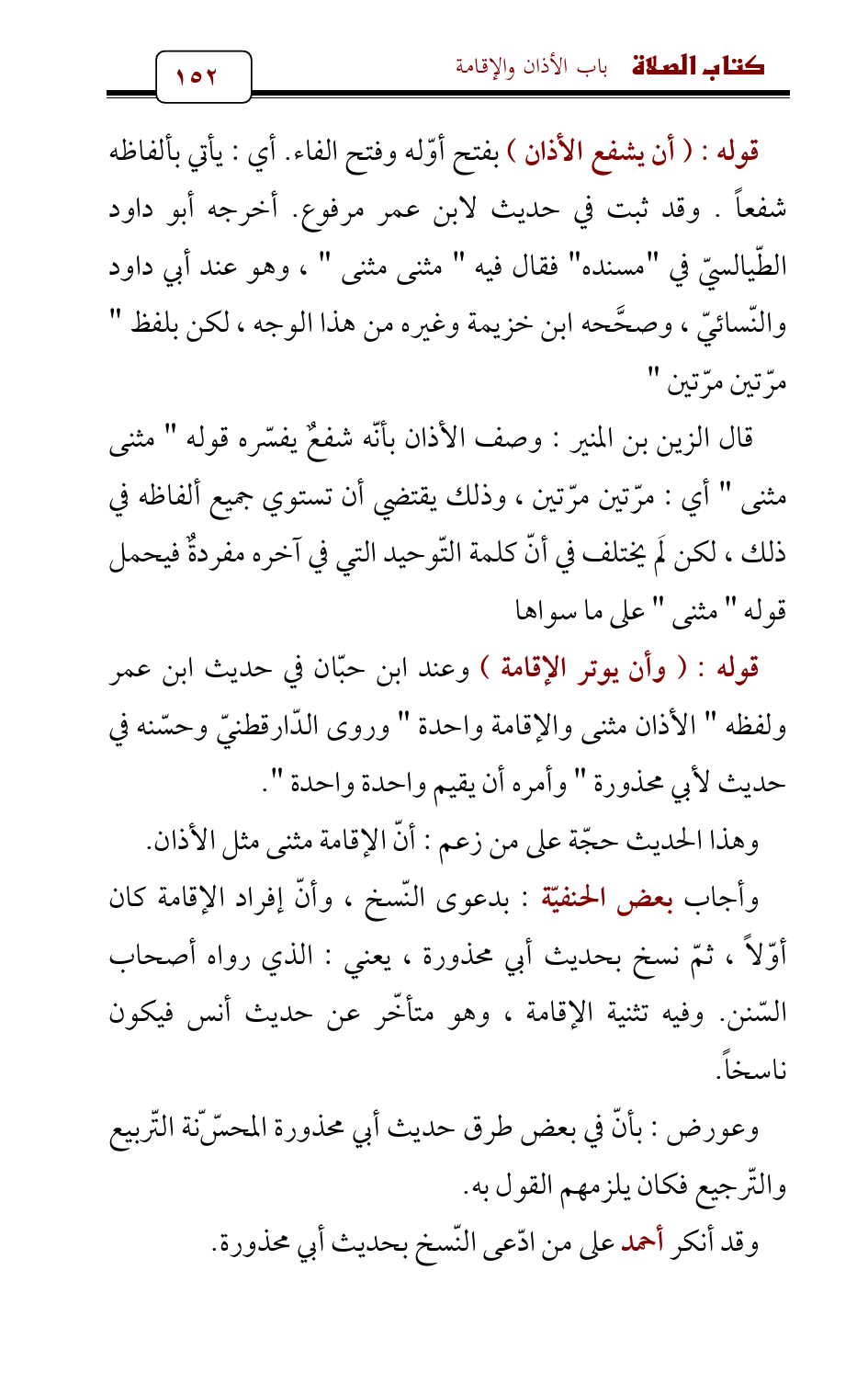 وأجاب بعض الحنفيّة: بدعوى النّسخ، وأنّ إفراد الإقامة كان أوّلاً , ثمّ نسخ بحديث أبي محذورة، يعني: الذي رواه أصحاب السّنن. وفيه تثنية الإقامة، وهو متأخّر عن حديث أنس فيكون ناسخاً.