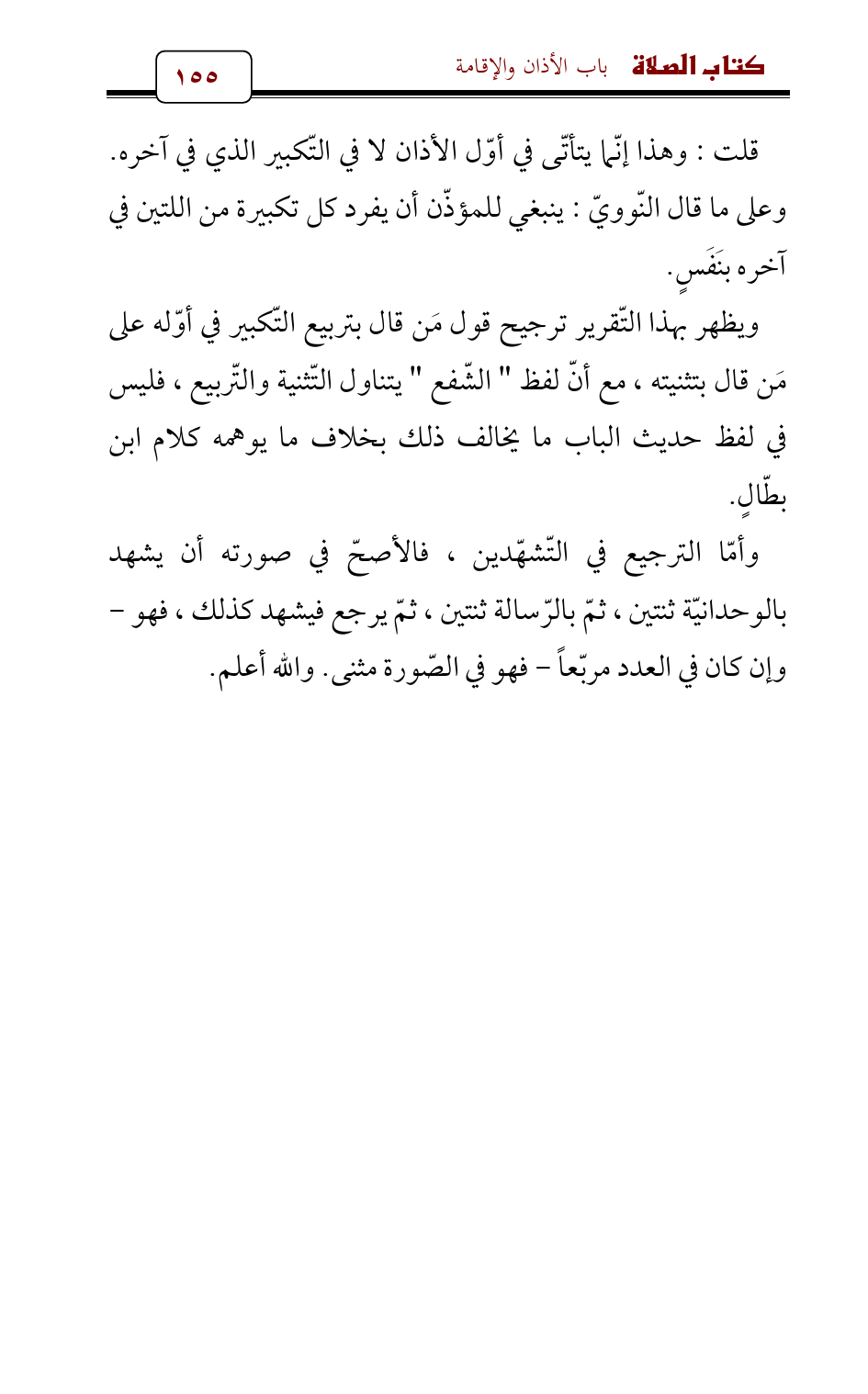 ويظهر بهذا التّقرير ترجيح قول مَن قال بتربيع التّكبير في أوّله على مَن قال بتثنيته، مع أنّ لفظ " الشّفع " يتناول التّثنية والتّربيع، فليس في لفظ حديث الباب ما يخالف ذلك بخلاف ما يوهمه كلام ابن بطّالٍ.