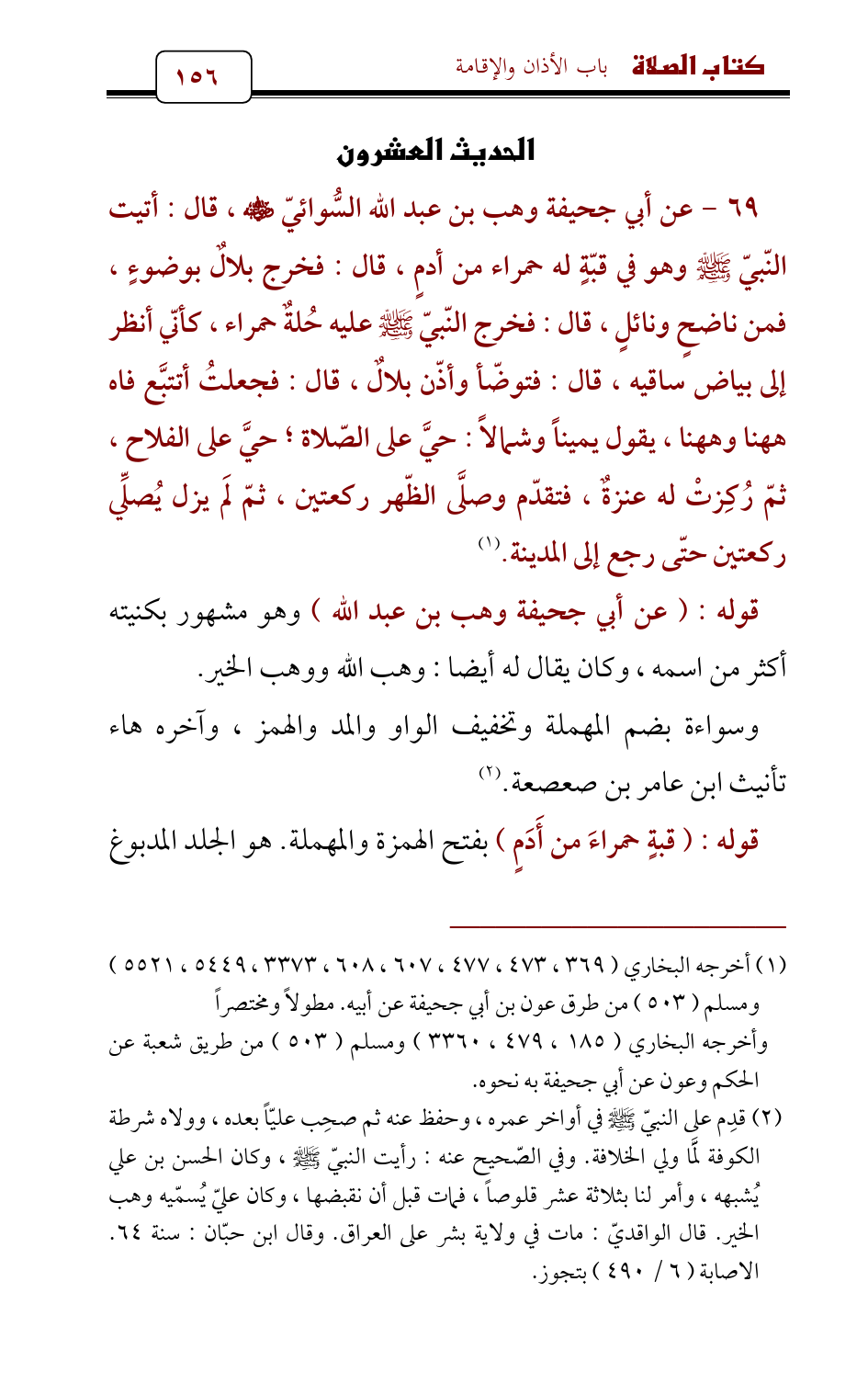 69 - عن أبي جحيفة وهب بن عبد الله السُّوائيّ - رضي الله عنه - , قال: أتيت النّبيّ - صلى الله عليه وسلم - وهو في قبّةٍ له حمراء من أدمٍ , قال: فخرج بلالٌ بوضوءٍ , فمن ناضحٍ ونائلٍ , قال: فخرج النّبيّ - صلى الله عليه وسلم - عليه حُلةٌ حمراء , كأنّي أنظر إلى بياض ساقيه , قال: فتوضّأ وأذّن بلالٌ , قال: فجعلتُ أتتبَّع فاه ههنا وههنا , يقول يميناً وشمالاً: حيَّ على الصّلاة ; حيَّ على الفلاح , ثمّ رُكِزتْ له عنزةٌ , فتقدّم وصلَّى الظّهر ركعتين , ثمّ لَم يزل يُصلِّي ركعتين حتّى رجع إلى المدينة. (¬1)
