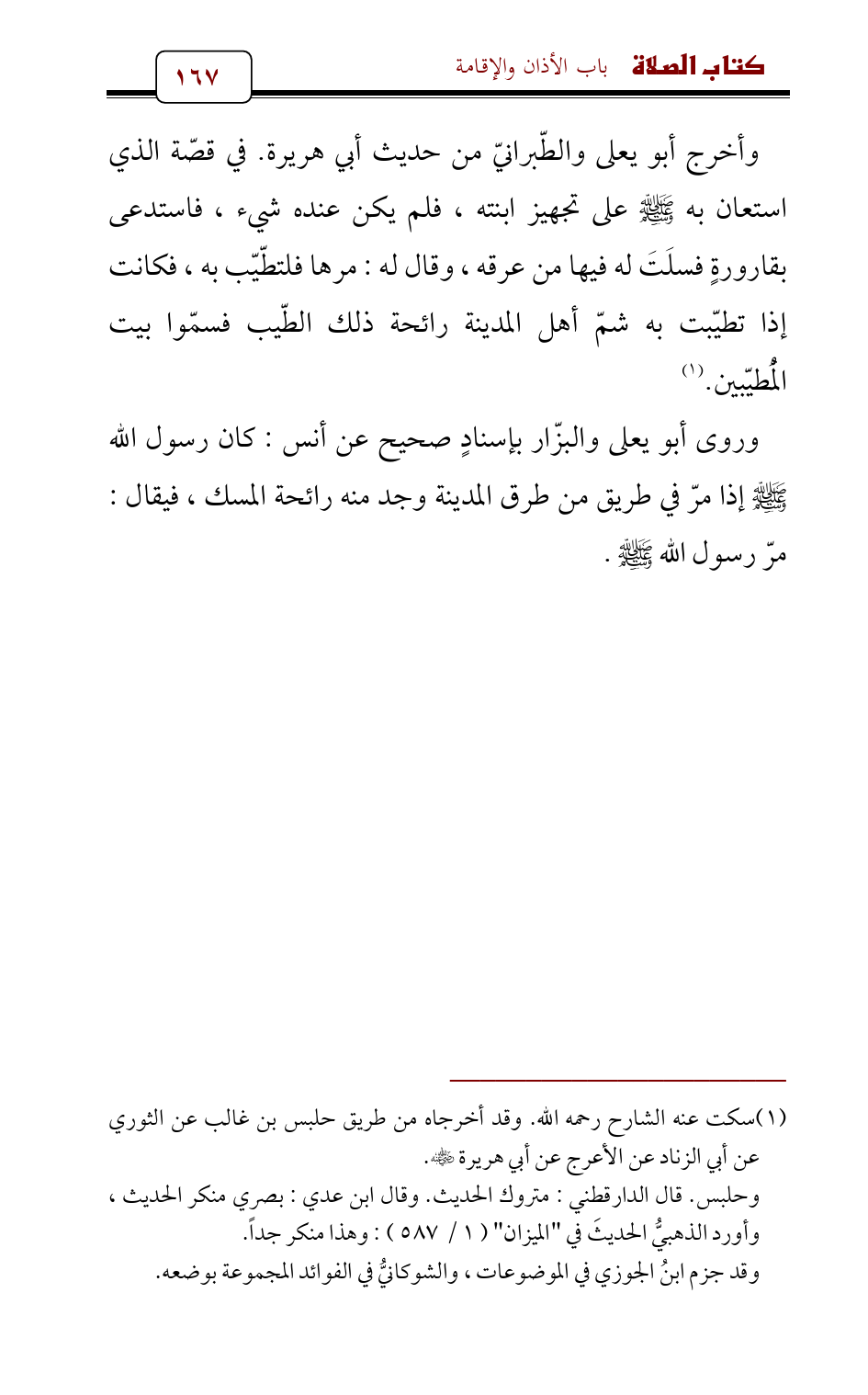 وأخرج أبو يعلى والطّبرانيّ من حديث أبي هريرة. في قصّة الذي استعان به - صلى الله عليه وسلم - على تجهيز ابنته , فلم يكن عنده شيء، فاستدعى بقارورةٍ فسلَتَ له فيها من عرقه , وقال له: مرها فلتطّيّب به، فكانت إذا تطيّبت به شمّ أهل المدينة رائحة ذلك الطّيب فسمّوا بيت الْمُطيّبين. (¬1)