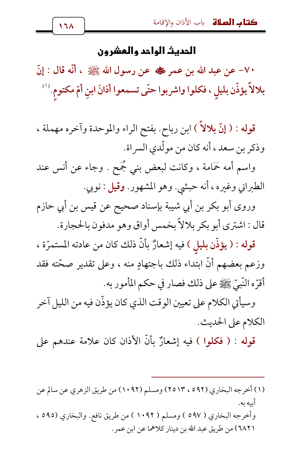 70 - عن عبد الله بن عمر - رضي الله عنه - عن رسول الله - صلى الله عليه وسلم - , أنّه قال: إنّ بلالاً يؤذّن بليلٍ , فكلوا واشربوا حتّى تسمعوا أذانَ ابنِ أمّ مكتومٍ. (¬1)