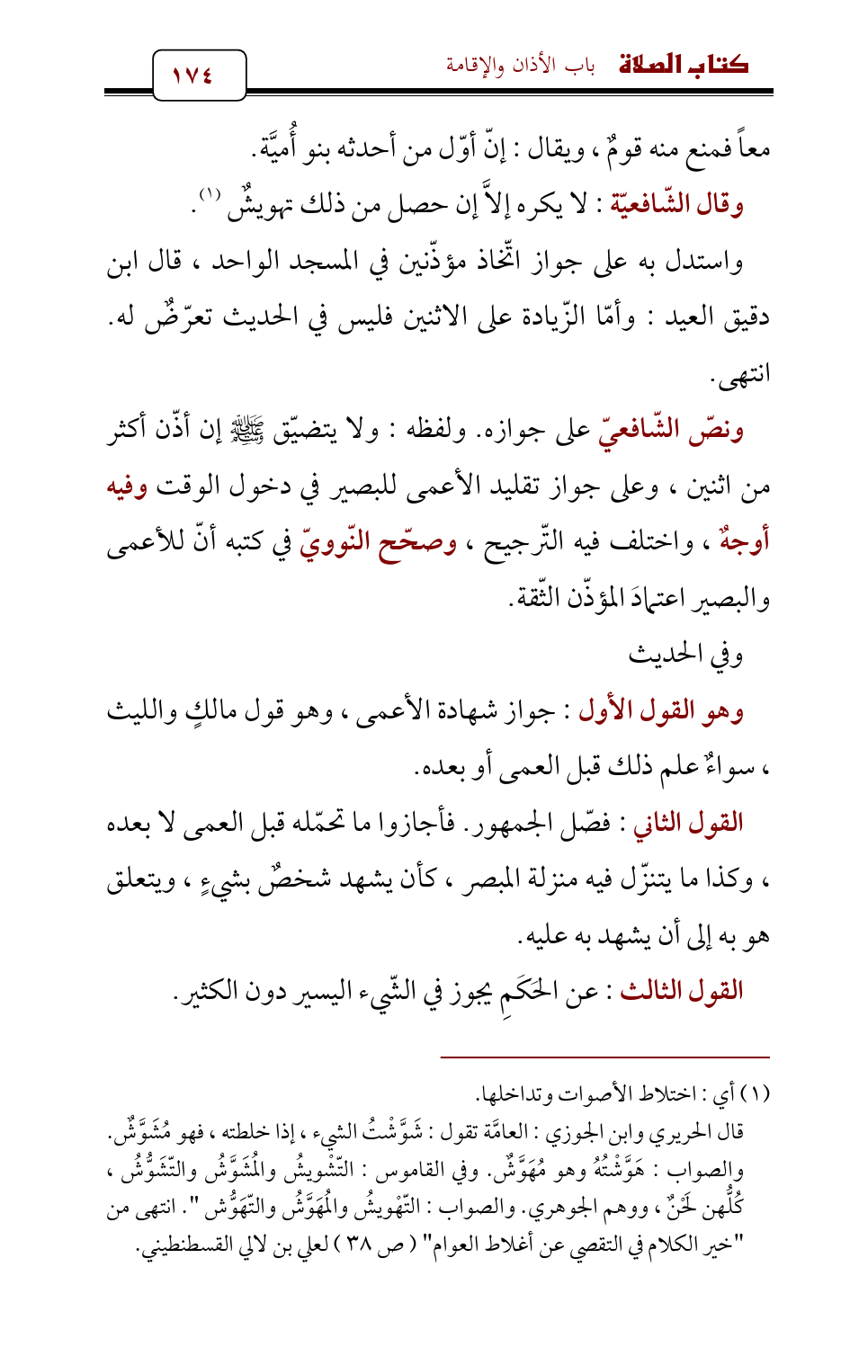 ونصّ الشّافعيّ على جوازه. ولفظه: ولا يتضيّق - صلى الله عليه وسلم - إن أذّن أكثر من اثنين، وعلى جواز تقليد الأعمى للبصير في دخول الوقت وفيه أوجهٌ، واختلف فيه التّرجيح، وصحّح النّوويّ في كتبه أنّ للأعمى والبصير اعتمادَ المؤذّن الثّقة.