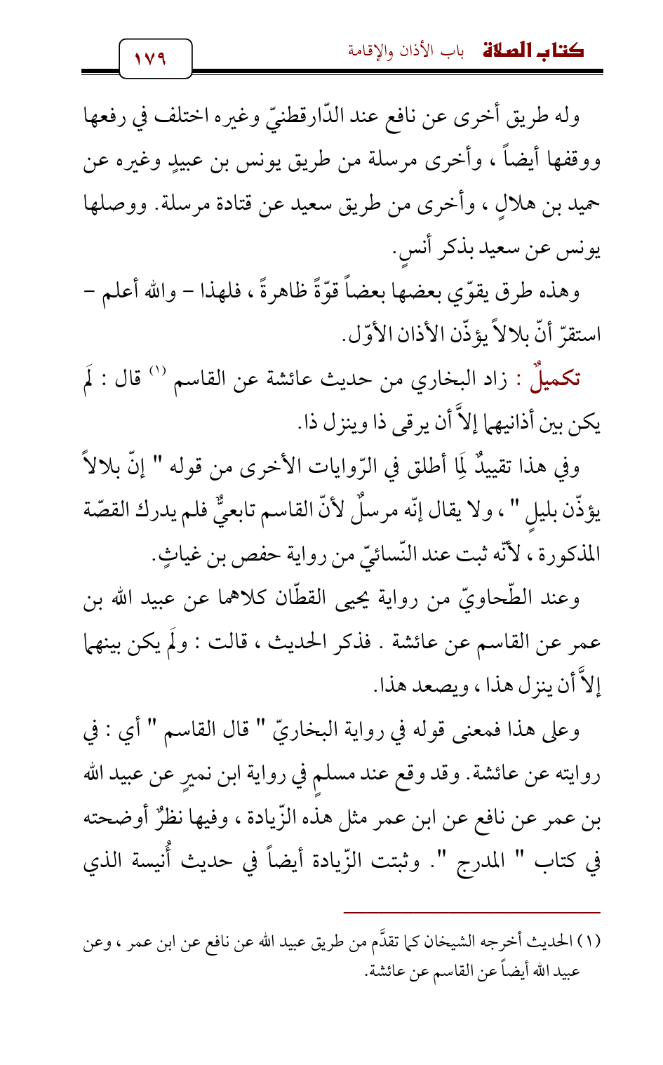 وفي هذا تقييدٌ لِمَا أطلق في الرّوايات الأخرى من قوله " إنّ بلالاً يؤذّن بليلٍ "، ولا يقال إنّه مرسلٌ لأنّ القاسم تابعيٌّ فلم يدرك القصّة المذكورة، لأنّه ثبت عند النّسائيّ من رواية حفص بن غياثٍ.