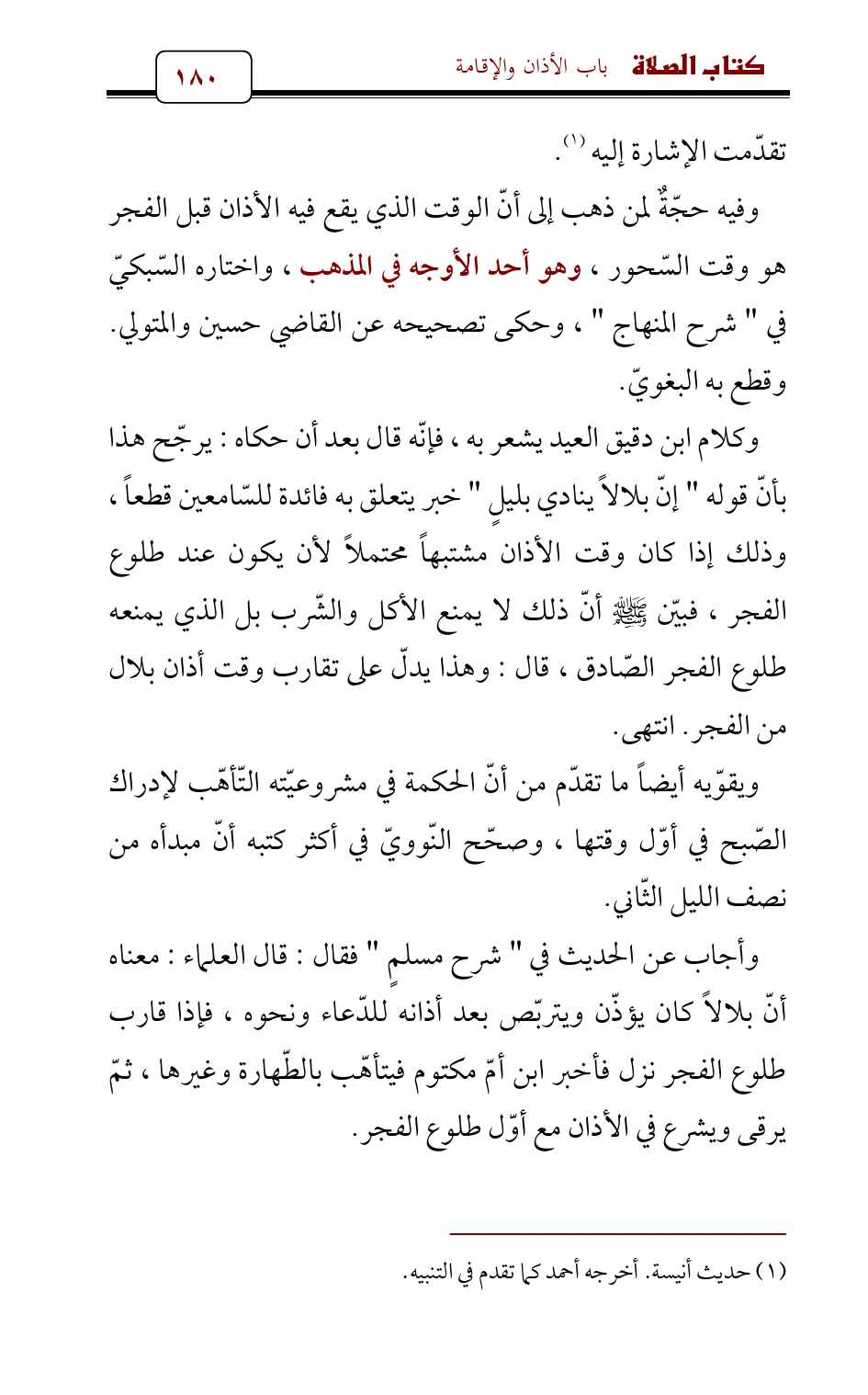وفيه حجّةٌ لمن ذهب إلى أنّ الوقت الذي يقع فيه الأذان قبل الفجر هو وقت السّحور، وهو أحد الأوجه في المذهب , واختاره السّبكيّ في " شرح المنهاج " , وحكى تصحيحه عن القاضي حسين والمتولي. وقطع به البغويّ.