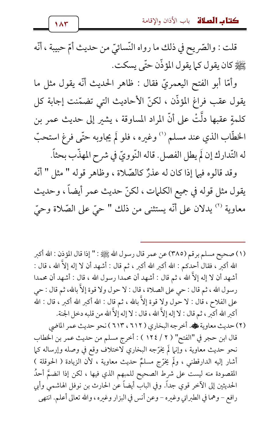 قلت: والصّريح في ذلك ما رواه النّسائيّ من حديث أمّ حبيبة , أنّه - صلى الله عليه وسلم - كان يقول كما يقول المؤذّن حتّى يسكت.
