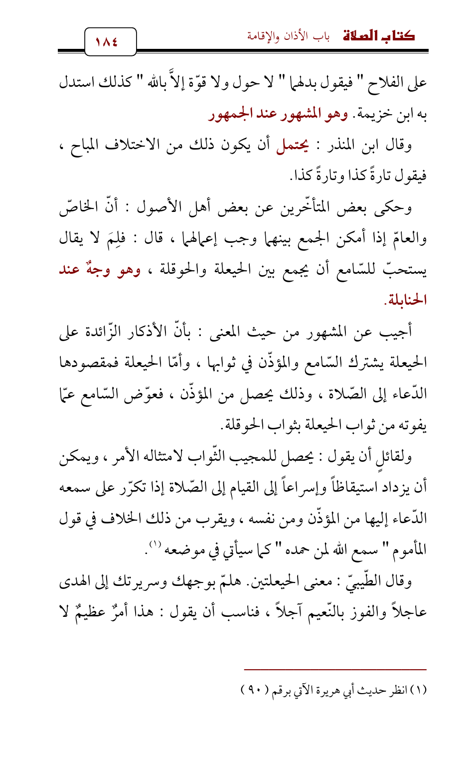 على الفلاح " فيقول بدلهما " لا حول ولا قوّة إلاَّ بالله " كذلك استدل به ابن خزيمة. وهو المشهور عند الجمهور