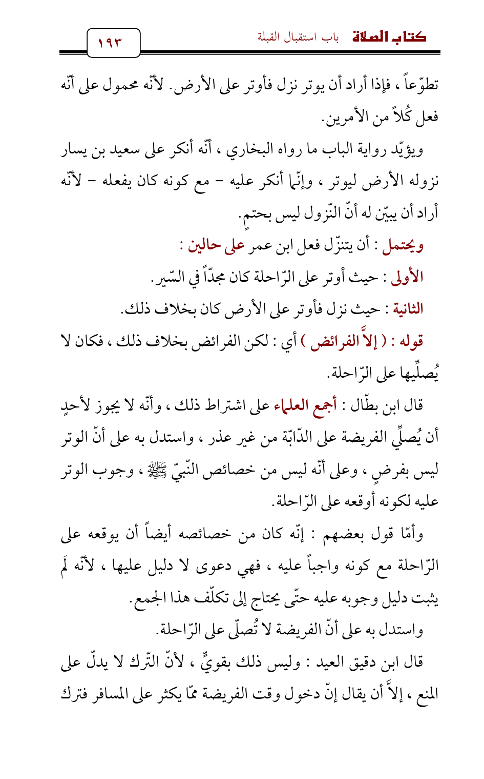 قال ابن بطّال: أجمع العلماء على اشتراط ذلك، وأنّه لا يجوز لأحدٍ أن يُصلِّي الفريضة على الدّابّة من غير عذر , واستدل به على أنّ الوتر ليس بفرضٍ، وعلى أنّه ليس من خصائص النّبيّ - صلى الله عليه وسلم - , وجوب الوتر عليه لكونه أوقعه على الرّاحلة.